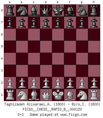 Last move : 0-1 2009 May 30 6:51:26 [Event "FICGS__CHESS__RAPID_B__000120"] [Site "FICGS"] [Date "2009.04.29"] [Round "1"] [White "Taghizadeh Alisaraei,Ahmad"] [Black "Biro,Istvan"] [Result "0-1"] [WhiteElo "1800"] [BlackElo "1800"] 0-1 This chess game has been lost on time (started : 2009.04.29 22:20:57) Player Black won this chess game. Follow this game move after move (download)It is not a move, even the best move that you must seek, but a realizable plan. (Eugene Znosko-Borovsky) Ich bin stolz ein Bulgare zu sein. (Veselin Topalov) El poder defensivo de una pieza clavada, solamente es imaginario. (Aaron Nimzovich) L'action d'une oeuvre littéraire se déroule sur un champ de bataille. Les masques et les types du drame moderne correspondent aux pièces du jeu d'échecs. L'intrigue correspond aux coups et aux gambits, c'est à dire aux techniques du jeu telles qu'utilisées et interprétées par les joueurs. Les tactiques et les péripéties [mouvements] correspondent aux coups exécutés par l'adversaire. (Viktor Shklovsky) A proverb is a short sentence based on long experience. (Miguel de Cervantes)