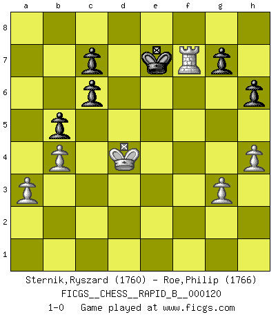 Last move : 1-0 2009 June 6 12:54:22 [Event "FICGS__CHESS__RAPID_B__000120"] [Site "FICGS"] [Date "2009.04.29"] [Round "1"] [White "Sternik,Ryszard"] [Black "Roe,Philip"] [Result "1-0"] [WhiteElo "1760"] [BlackElo "1766"] 1.e4 e5 2.Nf3 Nc6 3.d4 exd4 4.Bc4 Nf6 5.e5 d5 6.Bb5 Ne4 7.Nxd4 Bd7 8.Bxc6 bxc6 9.O-O Bc5 10.f3 Ng5 11.f4 Ne4 12.Be3 O-O 13.Nd2 Nxd2 14.Qxd2 Bb6 15.c4 Qe7 16.Rfc1 f6 17.c5 fxe5 18.Nb3 d4 19.Bf2 Rxf4 20.cxb6 axb6 21.Nxd4 Rxf2 22.Qxf2 exd4 23.Qxd4 Re8 24.b4 b5 25.Qc3 Qg5 26.Re1 h6 27.Rad1 Re7 28.Rxe7 Qxe7 29.h3 Be8 30.a3 Qe6 31.Qg3 Qe7 32.Qe1 Kf8 33.Qxe7+ Kxe7 34.Kf2 Bf7 35.Ke3 Bd5 36.g3 Be6 37.h4 Bf7 38.Kd4 Kd6 39.Rf1 Ke7 40.Rxf7+ 1-0 Scotch gambit : Dubois-Reti defense Kingside Castling by player White (move 9) Kingside Castling by player Black (move 12) Player White won this chess game. Follow this game move after move (download)Chess demands total concentration. (Bobby Fischer) Ich verachte die Medien. (Robert James Fischer) Morphy probablemente fue el genio más grande de todos. (Bobby Fischer) La guerre est enfant de la passion, la passion est enfant du narcissisme et le narcissisme est l'enfant. (...) Une autre partie ? (Thibault de Vassal) It's unlucky to be superstitious. (Dave Enteles)