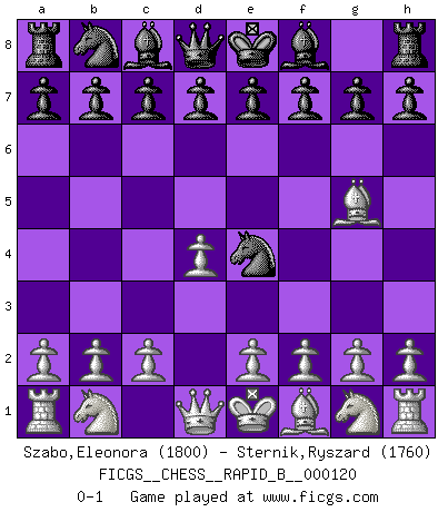 Last move : 0-1 2009 June 1 18:57:12 [Event "FICGS__CHESS__RAPID_B__000120"] [Site "FICGS"] [Date "2009.04.29"] [Round "1"] [White "Szabo,Eleonora"] [Black "Sternik,Ryszard"] [Result "0-1"] [WhiteElo "1800"] [BlackElo "1760"] 1.d4 Nf6 2.Bg5 Ne4 0-1 This chess game has been lost on time (started : 2009.04.29 22:20:57) Trompowsky attack (Ruth, Opovcensky Opening) Player Black won this chess game. Follow this game move after move (download)Pawns: they are the soul of this game, they alone form the attack and defense. (Philidor) Schachspieler können ausgezeichnet Varianten am Schachbrett berechnen, aber nicht im realen Leben. Zu stark ist der Individualismus im Schach ausgeprägt, und für viele ist ein kleiner momentaner persönlicher Vorteil wichtiger als ein weit größerer Vorteil von morgen. (Anatoly Karpov) Si yo gano un torneo, yo lo gano por mí mismo. Yo hago las jugadas. Nadie me ayuda. (Bobby Fischer) Les Echecs représentent une sphère d'idées créatrices basée sur la volonté des deux protagonistes. (Smyslov) Before all elsed, be armed. (Niccolo Machiavelli)
