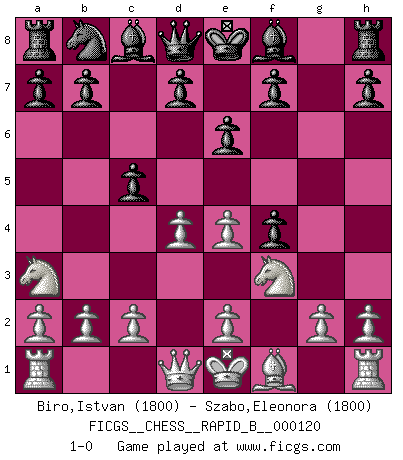 Last move : 1-0 2009 June 11 19:46:2 [Event "FICGS__CHESS__RAPID_B__000120"] [Site "FICGS"] [Date "2009.04.29"] [Round "1"] [White "Biro,Istvan"] [Black "Szabo,Eleonora"] [Result "1-0"] [WhiteElo "1800"] [BlackElo "1800"] 1.d4 Nf6 2.Bg5 Ne4 3.Bf4 c5 4.f3 g5 5.fxe4 gxf4 6.Nf3 e6 7.Na3 1-0 This chess game has been lost on time (started : 2009.04.29 22:20:57) Trompowsky attack (Ruth, Opovcensky Opening) Player White won this chess game. Follow this game move after move (download)Bobby Fischer is the greatest Chess player who has ever lived. (Ken Smith) Im Internet Chess Club betrug mein Rating vorübergehend 3350 ELO-Punkte. (Sergej Karjakin) El Ajedrez expande y enriquece tu mente. (Saudin Robovic) Lorsque vous vous retrouvez devant une position atroce, ne tendez pas un ultime piège dérisoire avec l'intention d'abandonner si l'adversaire le déjoue ! Faites-vous plutôt un devoir de résister comme si votre vie en dépendait. Jouez le coup qui vous déplairait au centuple si vous étiez dans la peau de votre tortionnaire ! There are two kinds of people in the world, my friend. Those who have a loaded gun and those who dig. You dig ! (Blondie in The Good, The Bad and The Ugly)
