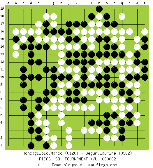 Last move : 0-1 2009 June 11 18:44:48 [Event "FICGS__GO__TOURNAMENT_KYU__000082"] [Site "FICGS"] [Date "2009.04.30"] [Round "1"] [Black "Roncagliolo,Marco"] [White "Segur,Laurine"] [Result "0-1"] [Rating 1 "0120"] [Rating 2 "0382"] 1.q4 q16 2.d4 d16 3.c14 c15 4.e14 f15 5.d15 c16 6.d13 e15 7.d14 f3 8.e3 f4 9.f5 e4 10.d3 e5 11.d5 f2 12.e6 f6 13.g5 d6 14.e7 d7 15.f7 g6 16.h6 g7 17.g8 h7 18.j7 h8 19.j8 h9 20.g9 h5 21.g4 h4 22.g3 g2 23.h3 j3 24.h2 j2 25.h1 j6 26.e2 j1 27.h10 j9 28.k8 l8 29.k9 k10 30.l9 m10 31.l7 m8 32.j10 h6 33.l10 k11 34.l11 l12 35.m9 n8 36.n10 m11 37.m12 n11 38.k12 j11 39.l13 h11 40.g10 e8 41.f8 f10 42.g11 h12 43.n9 o9 44.o10 k6 45.o11 n12 46.o8 o7 47.p9 n7 48.n13 o12 49.o13 p12 50.d8 e9 51.c7 m6 52.c6 r6 53.e10 d9 54.c9 n3 55.e12 e11 56.d10 d11 57.c10 f9 58.f11 e17 59.k7 l6 60.p11 q12 61.d12 q10 62.m13 q11 63.j12 h13 64.c11 k14 65.j13 j14 66.l12 m15 67.l14 l15 68.p13 p15 69.q13 r12 70.q9 s14 71.p7 r9 72.r8 q7 73.r10 s9 74.q8 p6 75.r7 p8 76.o9 p7 77.f14 g14 78.o14 s7 79.o15 o16 80.s12 r13 81.s10 s8 82.p5 p4 83.o4 p3 84.q3 q5 85.o5 s5 86.o3 p2 87.q2 o2 88.n4 m3 89.m4 l3 90.r4 s4 91.r5 q6 92.n15 n16 93.r14 s15 94.b15 b16 95.r15 r16 96.s13 q14 97.p14 q15 98.k15 k16 99.j15 h15 100.j16 e1 101.d1 g1 102.f1 s11 103.k17 l16 104.h16 g17 105.g16 g15 106.f17 f18 107.f16 g18 108.j17 e16 109.l17 m17 110.m18 n18 111.t11 r11 112.o18 q18 113.n19 n17 114.o17 m16 115.p17 p16 116.t10 m14 117.k13 h14 118.t12 b14 119.t14 b13 120.t15 t16 0-1 Here are the names of the openings (joseki) played in the four corners : Corner d16 : d16 c14 Hoshi (Hwajeom, Seongjeom, Xingwei`) 4-4 Point. The star or hoshi (4-4) point, emphasizing influence at the potential expense of territory. Ikken Kakari (Hankan Keolch'im, Yi Gua`jiao~, 1-Space Low Approach). Black 2 is the standard approach move to the 4-4. Corner d4 : d4 f3 Hoshi (Hwajeom, Seongjeom, Xingwei`) 4-4 Point. The star or hoshi (4-4) point, emphasizing influence at the potential expense of territory. Ikken Kakari (Hankan Keolch'im, Yi Gua`jiao~, 1-Space Low Approach). White 2 is the standard approach move to the 4-4. Corner q4 : q4 l8 Hoshi (Hwajeom, Seongjeom, Xingwei`) 4-4 Point. The star or hoshi (4-4) point, emphasizing influence at the potential expense of territory. Corner q16 : q16 l11 Hoshi (Hwajeom, Seongjeom, Xingwei`) 4-4 Point. The star or hoshi (4-4) point, emphasizing influence at the potential expense of territory. Player White won this Go (weiqi, baduk) game. Follow this game move after move (download)When your opponent is thick, you must also become thick. (Otake Hideo, 9p) Shallow men believe in luck. Strong men belive in cause and effect. (Ralph Waldo Emerson)