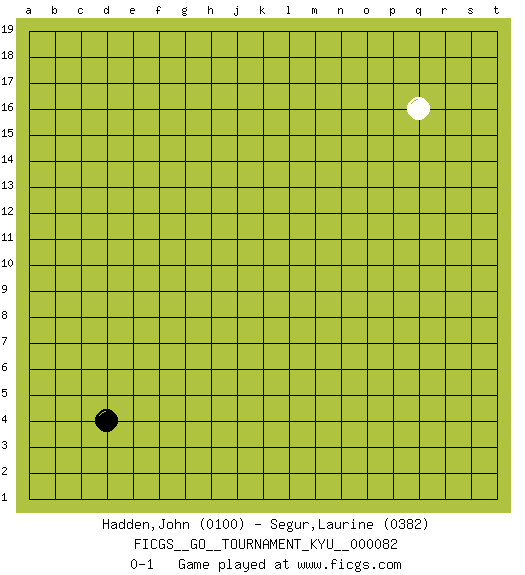 Last move : 0-1 2009 June 1 18:57:12 [Event "FICGS__GO__TOURNAMENT_KYU__000082"] [Site "FICGS"] [Date "2009.04.30"] [Round "1"] [Black "Hadden,John"] [White "Segur,Laurine"] [Result "0-1"] [Rating 1 "0100"] [Rating 2 "0382"] 1.d4 q16 0-1 This go game has been lost on time (started : 2009.04.30 18:47:50) Here are the names of the openings (joseki) played in the four corners : Player White won this Go (weiqi, baduk) game. Follow this game move after move (download)Stop on second, extend on third. (Anonymous) Cactus - It is depressed cucumber. (Ilmars Cirulis)