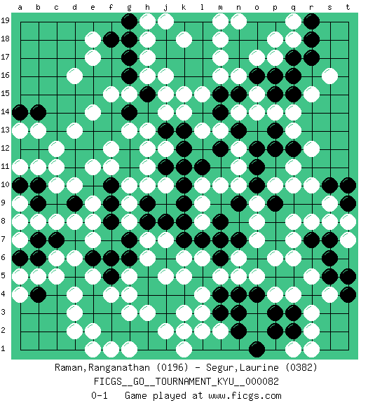 Last move : 0-1 2010 January 11 8:39:23 [Event "FICGS__GO__TOURNAMENT_KYU__000082"] [Site "FICGS"] [Date "2009.04.30"] [Round "1"] [Black "Raman,Ranganathan"] [White "Segur,Laurine"] [Result "0-1"] [Rating 1 "0196"] [Rating 2 "0382"] 1.k10 d4 2.q16 q4 3.o6 o5 4.p5 p4 5.o4 n5 6.p3 p6 7.p7 q6 8.q5 r5 9.n7 n6 10.q3 o3 11.h8 d16 12.k16 r3 13.n4 n3 14.m4 l4 15.m3 l3 16.n2 o2 17.p2 m2 18.o1 l2 19.l5 m5 20.n3 q1 21.m6 o7 22.m7 r2 23.q2 r1 24.r7 q7 25.p8 q8 26.s6 r8 27.t5 t7 28.s7 s8 29.s5 s4 30.t9 c6 31.r9 o8 32.p9 p10 33.n9 o9 34.q9 s9 35.s10 r10 36.q10 q11 37.m12 m10 38.k8 l9 39.m8 n10 40.l11 l8 41.l7 k6 42.j6 k5 43.k4 l6 44.k7 j5 45.k9 h17 46.n13 o17 47.p15 o14 48.n15 o15 49.o16 n16 50.p16 p17 51.n17 m16 52.m15 m17 53.n18 m18 54.o18 p18 55.p19 q18 56.q17 q19 57.o19 q14 58.r18 n19 59.r19 r15 60.p13 p14 61.l16 q13 62.o12 n14 63.m14 s16 64.l17 l13 65.l18 k14 66.l19 m13 67.k12 n11 68.o11 n12 69.o10 l15 70.k13 k15 71.j15 j14 72.j17 h16 73.h15 j16 74.g16 g15 75.h14 h13 76.g14 f15 77.g17 h18 78.g18 g13 79.f14 e14 80.f13 f12 81.e13 d13 82.e12 e11 83.d12 c12 84.d11 d10 85.c11 b11 86.b10 c10 87.a10 l10 88.k11 g9 89.r17 h11 90.h5 h6 91.g6 j7 92.g7 g5 93.j18 j19 94.k19 h19 95.g19 e17 96.f18 e18 97.h4 g4 98.j4 g3 99.g2 h3 100.j3 j2 101.h2 k2 102.f2 e2 103.f3 f4 104.e4 k3 105.j8 e5 106.e3 d2 107.f6 d3 108.h1 g8 109.f8 e7 110.e6 d6 111.d7 d8 112.c7 c8 113.b7 b8 114.a8 j10 115.b9 e8 116.b6 b5 117.a5 a4 118.a6 a7 119.h15 j15 120.f5 h7 121.d5 c5 122.b7 a9 123.a6 a8 124.d9 e9 125.h9 h10 126.f9 g10 127.t10 t8 128.q12 r12 129.p12 q10 130.q15 f1 131.j1 k1 132.b6 e1 133.p9 g1 134.c7 e5 135.b4 a5 136.f10 f11 137.a12 b13 138.b12 c11 139.a14 a13 140.b14 a11 141.j13 j12 142.j11 h12 143.t4 m19 144.g14 k18 145.k17 k18 0-1 This go game has been lost on time (started : 2009.04.30 18:47:50) Here are the names of the openings (joseki) played in the four corners : Corner q4 : q4 o6 Hoshi (Hwajeom, Seongjeom, Xingwei`) 4-4 Point. The star or hoshi (4-4) point, emphasizing influence at the potential expense of territory. Corner d4 : d4 h8 Hoshi (Hwajeom, Seongjeom, Xingwei`) 4-4 Point. The star or hoshi (4-4) point, emphasizing influence at the potential expense of territory. Corner q16 : q16 q11 Hoshi (Hwajeom, Seongjeom, Xingwei`) 4-4 Point. The star or hoshi (4-4) point, emphasizing influence at the potential expense of territory. Player White won this Go (weiqi, baduk) game. Follow this game move after move (download)To invade, need 20 points in open area; otherwise, keshi is best. (Yang Yilun, 7p) There's always a bigger fish. (Qui-Gon Jinn in Star Wars ep.1)