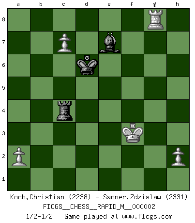 Last move : 1/2-1/2 2006 July 23 22:43:31 [Event "FICGS__CHESS__RAPID_M__000002"] [Site "FICGS"] [Date "2006.04.18"] [Round "1"] [White "Koch,Christian"] [Black "Sanner,Zdzislaw"] [Result "1/2-1/2"] [WhiteElo "2238"] [BlackElo "2331"] 1.e4 Nf6 2.e5 Nd5 3.c4 Nb6 4.d4 d6 5.exd6 cxd6 6.Nc3 g6 7.Be3 Bg7 8.Rc1 O-O 9.b3 e5 10.dxe5 dxe5 11.Qxd8 Rxd8 12.c5 N6d7 13.Bc4 Nc6 14.Nf3 Na5 15.Bb5 Nf8 16.O-O Bg4 17.Ng5 a6 18.Ba4 Nc6 19.f3 Bf5 20.g4 Bd3 21.Rf2 h6 22.Bxc6 bxc6 23.Nge4 Bxe4 24.Nxe4 Rxd3 25.Re1 f5 26.gxf5 gxf5 27.Nd6 f4 28.Bc1 Nd7 29.Bb2 Bf6 30.Rc1 Kh7 31.Ne4 Be7 32.R2f1 Rd8 33.b4 Kg6 34.Rc3 Rd5 35.Ra3 Ra8 36.Kg2 Nf6 37.Rf2 Kf5 38.Re2 Rg8 39.Kh3 Nh7 40.Rxa6 Ng5 41.Nxg5 hxg5 42.Rxc6 g4 43.fxg4+ Rxg4 44.Rxe5+ Rxe5 45.Bxe5 Rh4 46.Kg2 Kxe5 47.Rc8 f3 48.Kxf3 Rxb4 49.c6 Kd6 50.c7 Rc4 51.Rg8 1/2-1/2 Alekhine's defense Kingside Castling by player Black (move 8) Kingside Castling by player White (move 16) 10 pieces endgame at move 46 : White KRPPPP , Black KRBP WHITE : King + 1 Rook 4 Pawns BLACK : King + 1 Rook 1 Bishop 1 Pawn 9 pieces endgame at move 48 : White KRPPPP , Black KRB WHITE : King + 1 Rook 4 Pawns BLACK : King + 1 Rook 1 Bishop 8 pieces endgame at move 48 : White KRPPP , Black KRB WHITE : King + 1 Rook 3 Pawns BLACK : King + 1 Rook 1 Bishop This chess game ended in a draw. Follow this game move after move (download)Nowadays, when you're not a grandmaster at 14, you can forget about it. (Anand Viswanathan) Es war undenkbar für die Behörden, dass ein sowjetischer Großmeister auf diese Art und Weise [Fischer-Taimanov 6:0] verliert, ohne dass es eine politischer Erklärung dafür gäbe. (Mark Taimanov) A la fecha, Fischer esta simplemente un nivel arriba de todos los mejores jugadores de Ajedrez del mundo. (John Jacobs) Les Echecs ont trois composantes : le temps, l'espace et le matériel en dernier. (Mikhail Tal) Convictions are more dangerous enemies of truth than lies. (Friedrich Nietzsche)