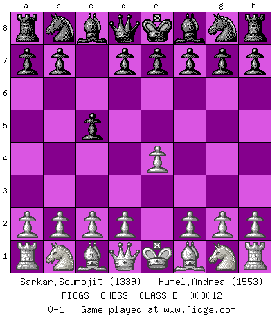 Last move : 0-1 2006 October 22 19:24:36 [Event "FICGS__CHESS__CLASS_E__000012"] [Site "FICGS"] [Date "2006.09.10"] [Round "1"] [White "Sarkar,Soumojit"] [Black "Humel,Andrea"] [Result "0-1"] [WhiteElo "1339"] [BlackElo "1553"] 1.e4 c5 0-1 This chess game has been lost on time (started : 2006.09.10 15:18:36) Sicilian defense Player Black won this chess game. Follow this game move after move (download)It is peculiar but a fact nevertheless, that gamblers in chess always have enthusiastic followers. (Botvinnik) Ich bin Weltmeister und muß mit niemandem irgend etwas diskutieren. (Viswanathan Anand) No es tiempo de jugar al Ajedrez cuando la casa esta en llamas. (Proverbio Italiano) Nous vivons dans un monde échiquéen : chaque jour qui passe est un défi à relever. (Philosophe Sasha) The difference between perseverance and obstinacy is that one comes from a strong will, and the other from a strong won't. (Henry Ward Beecher)