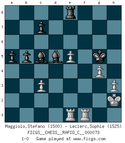Last move : 1-0 2009 August 29 21:37:47 [Event "FICGS__CHESS__RAPID_C__000073"] [Site "FICGS"] [Date "2009.05.01"] [Round "1"] [White "Maggiolo,Stefano"] [Black "Leclerc,Sophie"] [Result "1-0"] [WhiteElo "1500"] [BlackElo "1525"] 1.e4 e5 2.Nf3 Nc6 3.Bb5 Nf6 4.O-O Bc5 5.c3 O-O 6.d4 Bb6 7.Bg5 h6 8.Bh4 exd4 9.e5 g5 10.Bxc6 dxc6 11.Nxg5 dxc3 12.Qxd8 Rxd8 13.Nxc3 Nd5 14.Nxf7 Re8 15.Nxh6+ Kg7 16.Bg5 Nxc3 17.Bf6+ Kxh6 18.bxc3 Be6 19.Kh1 Bc5 20.f4 Bd5 21.h3 Rg8 22.Bg5+ Rxg5 23.fxg5+ Kxg5 24.a4 Re8 25.Rae1 a5 26.Kh2 b5 27.axb5 cxb5 28.g4 1-0 This chess game has been lost on time (started : 2009.05.01 12:1:1) Ruy Lopez : Berlin defense, Beverwijk variation Kingside Castling by player White (move 4) Kingside Castling by player Black (move 5) Player White won this chess game. Follow this game move after move (download)On the chessboard, lies and hypocrisy do not survive long. (Emanuel Lasker) Wer mein Gambit spielt, muß bereit sein, alle Brücken hinter sich abzubrechen. Es verändert den ganzen Menschen. Es wirkt wie ein Zauberstab und fördert verkümmerte, gute Charakter- eigenschaften wieder zu Tage. (Emil Joseph Diemer) Yo siempre he tenido un ligero sentimiento de lástima por una persona que no tiene conocimiento del Ajedrez. (Siegbert Tarrasch) En blitz, le Cavalier l'emporte sur le Fou. (Vlastimil Hort) All the biggest technological inventions created by man - the airplane, the automobile, the computer - says little about his intelligence, but speaks volumes about his laziness. (Mark Kennedy)