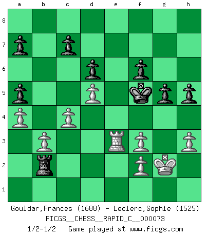 Last move : 1/2-1/2 2009 August 2 17:39:56 [Event "FICGS__CHESS__RAPID_C__000073"] [Site "FICGS"] [Date "2009.05.01"] [Round "1"] [White "Gouldar,Frances"] [Black "Leclerc,Sophie"] [Result "1/2-1/2"] [WhiteElo "1688"] [BlackElo "1525"] 1.e4 d6 2.d4 Nf6 3.Nc3 g6 4.Nf3 Bg7 5.Bd3 Nc6 6.d5 Nb4 7.Be2 O-O 8.a3 Na6 9.Bxa6 bxa6 10.O-O e6 11.Re1 Rb8 12.Rb1 Nxd5 13.Nxd5 exd5 14.exd5 Re8 15.b3 Rxe1+ 16.Qxe1 Bf5 17.Qd2 Qe7 18.Bb2 Bxb2 19.Rxb2 Be4 20.c4 Re8 21.Qe3 Bxf3 22.Qxe7 Rxe7 23.gxf3 Re1+ 24.Kg2 Kg7 25.Rc2 a5 26.Rc3 Kf6 27.Re3 Rb1 28.a4 Rb2 29.Kg3 g5 30.Kg2 h5 31.Rd3 Kf5 32.Re3 f6 33.h3 1/2-1/2 Pirc : Classical (Two knights) system Kingside Castling by player Black (move 7) Kingside Castling by player White (move 10) This chess game ended in a draw. Follow this game move after move (download)Robert Fischer is a law unto himself. (Larry Evans) Schachspieler können ausgezeichnet Varianten am Schachbrett berechnen, aber nicht im realen Leben. Zu stark ist der Individualismus im Schach ausgeprägt, und für viele ist ein kleiner momentaner persönlicher Vorteil wichtiger als ein weit größerer Vorteil von morgen. (Anatoly Karpov) Antes de los Finales, los dioses han colocado el Juego Medio. (Siegbert Tarrasch) Karpov est une pièce de musée. (Garry Kasparov) The worth of a book is to be measured by what you can carry away from it. (James Bryce)