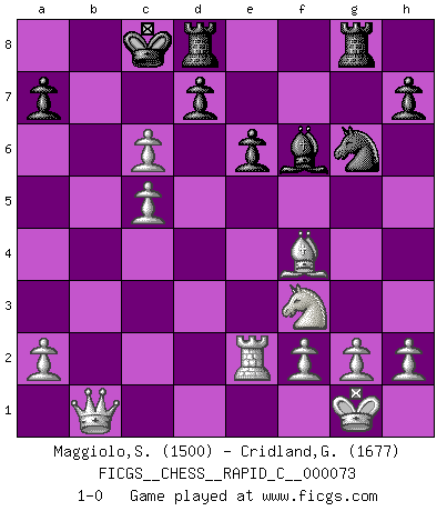 Last move : 1-0 2009 June 27 19:17:5 [Event "FICGS__CHESS__RAPID_C__000073"] [Site "FICGS"] [Date "2009.05.01"] [Round "1"] [White "Maggiolo,Stefano"] [Black "Cridland,Graham"] [Result "1-0"] [WhiteElo "1500"] [BlackElo "1677"] 1.e4 c5 2.Nf3 Nc6 3.d4 cxd4 4.Nxd4 Nf6 5.Nc3 e6 6.Nxc6 bxc6 7.e5 Nd5 8.Ne4 Qa5+ 9.c3 Ba6 10.Be2 f5 11.exf6 gxf6 12.O-O Be7 13.Re1 f5 14.Ng5 f4 15.Nf3 Bxe2 16.Rxe2 Qc7 17.Qd4 Bf6 18.Qe4 O-O-O 19.c4 Ne7 20.Bxf4 Qb6 21.Rb1 Rhg8 22.b4 Ng6 23.c5 Qa6 24.b5 Qb7 25.bxc6 Qxb1+ 26.Qxb1 1-0 Sicilian defense Kingside Castling by player White (move 12) Queenside Castling by player Black (move 18) Player White won this chess game. Follow this game move after move (download)Avoid the crowd. Do your own thinking independently. Be the Chess player, not the Chess piece. (Ralph Charell) Eine Person mit durchschnittlichem IQ kann etwa eine ELO von 2000 erreichen. (Jonathan Levitt) Con el tiempo, empecé a progresar en partidas decisivas. Tal vez porque me di cuenta de una simple verdad: no solo estaba yo nervioso sino también mi oponente. (Mikhail Tal) Les écrivains ont utilisé les échecs pour analyser les côtés extrêmes de la nature humaine. Dans ce cadre, les échecs offrent un champ d'expérimentation idéal. Mais on pourrait faire la même chose avec la peinture. Et là, en vous référant à Van Gogh, vous ne tirerez pas de conclusion définitive sur les peintres. (Gary Kasparov) The difference between stupidity and genius is that genius has its limits. (Murphy)
