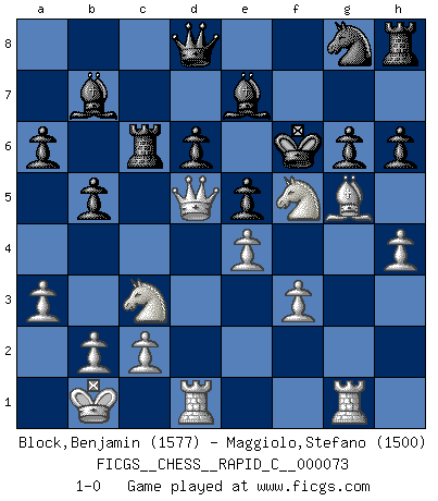 Last move : 1-0 2009 July 31 9:36:17 [Event "FICGS__CHESS__RAPID_C__000073"] [Site "FICGS"] [Date "2009.05.01"] [Round "1"] [White "Block,Benjamin"] [Black "Maggiolo,Stefano"] [Result "1-0"] [WhiteElo "1577"] [BlackElo "1500"] 1.e4 c5 2.Nf3 d6 3.d4 cxd4 4.Nxd4 Nf6 5.Nc3 a6 6.Be3 e6 7.f3 b5 8.g4 h6 9.a3 Nbd7 10.Qd2 Bb7 11.O-O-O Rc8 12.h4 Be7 13.Kb1 Ne5 14.Be2 Nc4 15.Bxc4 Rxc4 16.g5 Ng8 17.g6 e5 18.gxf7+ Kxf7 19.Nf5 Rc6 20.Rhg1 g6 21.Qd5+ Kf6 22.Bg5+ 1-0 Sicilian : Najdorf, Byrne (English) attack Queenside Castling by player White (move 11) Player White won this chess game. Follow this game move after move (download)Fischer is an American Chess tragedy on par with Morphy and Pillsbury. (Mig Greengard) Im Hotelzimmer gab es nur zwei Schaben. (Über die Turnierbedingungen) (Peter Swidler) Vive, pierde y aprende al observar a tu oponente como gana. (Amber Steenbock) RxDa4 pat (...) If we don't succeed, we run the risk of failure. (George W. Bush)