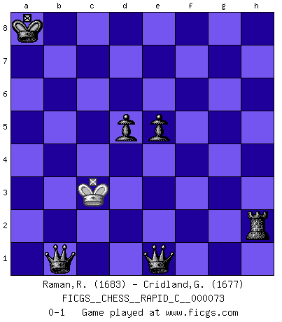 Last move : 0-1 2009 June 30 0:24:47 [Event "FICGS__CHESS__RAPID_C__000073"] [Site "FICGS"] [Date "2009.05.01"] [Round "1"] [White "Raman,Ranganathan"] [Black "Cridland,Graham"] [Result "0-1"] [WhiteElo "1683"] [BlackElo "1677"] 1.e4 c5 2.Nf3 Nc6 3.c3 d5 4.e5 Bg4 5.d4 e6 6.Qb3 Qc7 7.Na3 a6 8.Be3 Rc8 9.h3 Bh5 10.g4 Bg6 11.Bg2 Be4 12.O-O-O b5 13.Rhe1 b4 14.cxb4 cxb4 15.Nc2 Nxe5 16.dxe5 Qxc2+ 17.Qxc2 Rxc2+ 18.Kb1 Rxf2 19.Ka1 Rxg2 20.Nd2 f5 21.Nxe4 fxe4 22.g5 Kd7 23.Rc1 Be7 24.h4 Bd8 25.b3 Ne7 26.Bc5 Nc6 27.Rcd1 Rg4 28.Rf1 Be7 29.Rf7 h6 30.Rxg7 hxg5 31.hxg5 Rxg5 32.Rxg5 Bxg5 33.Kb2 Nxe5 34.Bxb4 e3 35.Bc3 e2 36.Re1 Nd3+ 37.Kc2 Nxe1+ 38.Bxe1 Bh4 39.Kd2 Bxe1+ 40.Kxe1 Rh2 41.a4 Kd6 42.b4 Kc6 43.Kd2 e5 44.b5+ axb5 45.a5 b4 46.a6 b3 47.a7 Kb7 48.Ke1 b2 49.Kd2 b1Q 50.a8Q+ Kxa8 51.Kc3 e1Q+ 0-1 Sicilian defense Queenside Castling by player White (move 12) 10 pieces endgame at move 39 : White KPP , Black KRBPPPP WHITE : King + 2 Pawns BLACK : King + 1 Rook 1 Bishop 4 Pawns 9 pieces endgame at move 40 : White KPP , Black KRPPPP WHITE : King + 2 Pawns BLACK : King + 1 Rook 4 Pawns 8 pieces endgame at move 44 : White KP , Black KRPPPP WHITE : King + 1 Pawn BLACK : King + 1 Rook 4 Pawns Promotion Queen by player Black (move 49) Promotion Queen by player White (move 50) 7 pieces endgame at move 50 : White K , Black KQRPPP WHITE : King + BLACK : King + 1 Queen 1 Rook 3 Pawns Promotion Queen by player Black (move 51) Player Black won this chess game. Follow this game move after move (download)Discovered check is the dive bomber of the Chessboard. (Reuben Fine) Ich erzeugte keinen Neid, da mich die Schachspieler als Musiker und die Musiker als Schachspieler betrachteten. (Mark Taimanov) A la fecha, Fischer esta simplemente un nivel arriba de todos los mejores jugadores de Ajedrez del mundo. (John Jacobs) Les Cavaliers se révèlent fort utiles dans les positions fermées. D'habitude, les Fous sont un peu plus forts que les Cavaliers dans les positions ouvertes. Qu'on le veuille ou non, il restera toujours des exceptions ! For a mechanic, you seem to do an excessive amount of thinking. (C-3PO in Star Wars ep.2)