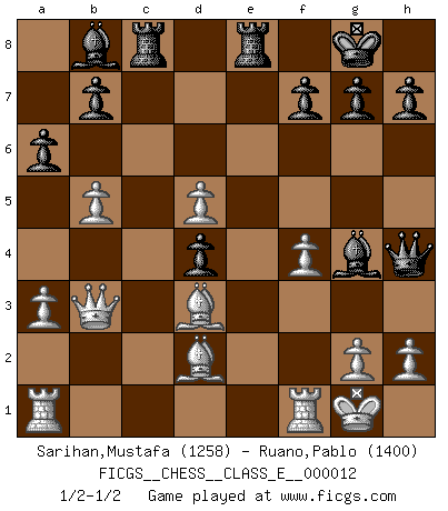 Last move : 1/2-1/2 2007 January 31 12:4:7 [Event "FICGS__CHESS__CLASS_E__000012"] [Site "FICGS"] [Date "2006.09.10"] [Round "1"] [White "Sarihan,Mustafa"] [Black "Ruano,Pablo"] [Result "1/2-1/2"] [WhiteElo "1258"] [BlackElo "1400"] 1.d4 d5 2.c4 c6 3.cxd5 cxd5 4.Nc3 Nf6 5.Nf3 Nc6 6.e3 e6 7.Bd3 Bd6 8.O-O O-O 9.a3 Bd7 10.Nb5 Bb8 11.Qc2 a6 12.Nc3 e5 13.e4 Nxd4 14.Nxd4 exd4 15.Nxd5 Nxd5 16.exd5 Qh4 17.f4 Re8 18.b4 Ba7 19.Bd2 Rac8 20.Qd1 Bg4 21.Qb3 Bb8 22.b5 1/2-1/2 QGD Slav defense : Exchange variation Kingside Castling by player White (move 8) Kingside Castling by player Black (move 8) This chess game ended in a draw. Follow this game move after move (download)Chess is a forcing house where the fruits of character can ripen more fully than in life. (Edward Morgan Foster) Im Fernschach kannst du während dem Spiel rauchen. (John Christen Knudsen) Bobby solo arroja las piezas y solas caen en las casillas correctas. (Miguel Najdorf ) Avant la finale, les dieux ont créé le milieu de partie. (Tarrasch) The Internet is the world's largest library. It's just that all the books are on the floor. (John Allen Paulos)