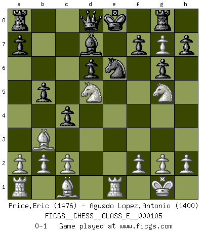 Last move : 0-1 2009 July 7 17:5:56 [Event "FICGS__CHESS__CLASS_E__000105"] [Site "FICGS"] [Date "2009.05.01"] [Round "1"] [White "Price,Eric"] [Black "Aguado Lopez,Antonio"] [Result "0-1"] [WhiteElo "1476"] [BlackElo "1400"] 1.e4 e5 2.Nf3 d6 3.d4 exd4 4.Nxd4 Qe7 5.Nc3 g6 6.Bc4 Nf6 7.O-O Bd7 8.Bb3 c5 9.Nf3 b5 10.Ng5 c4 11.Nd5 Qd8 12.Qd4 Bg7 13.e5 Nc6 14.exf6 Nxd4 15.fxg7 Rg8 16.Re1+ Ne6 0-1 Philidor : Exchange variation Kingside Castling by player White (move 7) Player Black won this chess game. Follow this game move after move (download)In Chess, as it is played by masters, chance is practically eliminated. (Emanuel Lasker) In Buenos Aires ist es nicht mein vorrangiges Ziel ein starkes Turnier zu organisieren, sondern ein Turnier für Gentlemen. Ich würde nie Kamsky einladen. Ich mag keine Probleme. (Miguel Najdorf) No nos podemos resistir a la fascinación de un sacrificio ya que la pasión por los sacrificios es parte de la naturaleza de un jugador de Ajedrez. (Rudolf Spielman) Le succès, c'est être capable d'aller d'échec en échec sans perdre son enthousiasme. (Winston Churchill) Good decisions come from experience, and experience comes from bad decisions. (Anonymous)