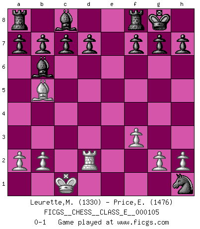 Last move : 0-1 2009 May 13 18:5:10 [Event "FICGS__CHESS__CLASS_E__000105"] [Site "FICGS"] [Date "2009.05.01"] [Round "1"] [White "Leurette,Marc-Antoine"] [Black "Price,Eric"] [Result "0-1"] [WhiteElo "1330"] [BlackElo "1476"] 1.e4 e5 2.Nf3 Nc6 3.d4 exd4 4.Nxd4 Bc5 5.Be3 Qf6 6.Qf3 Nxd4 7.Qxf6 Nxf6 8.Nc3 Nxc2+ 9.Ke2 Bxe3 10.Rd1 Bb6 11.Rd2 Nd4+ 12.Kd1 O-O 13.Nb5 Nxb5 14.Bxb5 Nxe4 15.f3 Nf2+ 16.Kc1 Nxh1 0-1 Scotch game Kingside Castling by player Black (move 12) Player Black won this chess game. Follow this game move after move (download)Without error there can be no brilliancy. (Emanuel Lasker) Ich weiss nicht was Gott gegen mich auf 1.e4 antworten würde. (Robert James Fischer) El juego del Ajedrez no es solamente una diversión quieta; algunas cualidades muy valuables de la mente se pueden adquirir y cultivar con el, como convertirlos en habitos disponibles para toda ocasión; ya que la vida es algo así como el Ajedrez. (Benjamin Franklin) Horreur, mais aussi harmonie suprême : qu'y avait-il en effet au monde en dehors des échecs ? Le brouillard, l'inconnu, le non-être... (Vladimir Nabokov) Employ the attack like tactic of defense. (Chinese proverb)