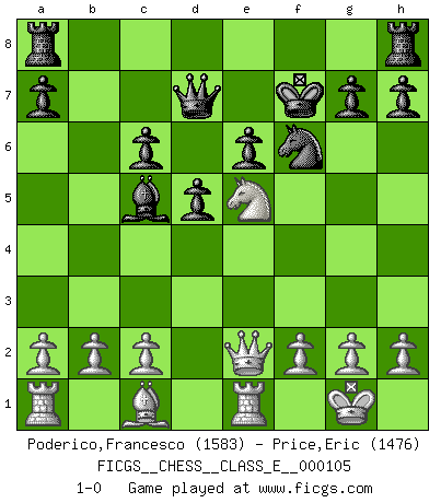 Last move : 1-0 2009 May 20 1:38:59 [Event "FICGS__CHESS__CLASS_E__000105"] [Site "FICGS"] [Date "2009.05.01"] [Round "1"] [White "Poderico,Francesco"] [Black "Price,Eric"] [Result "1-0"] [WhiteElo "1583"] [BlackElo "1476"] 1.e4 e6 2.d4 d5 3.Nd2 c5 4.exd5 exd5 5.Ngf3 Nf6 6.Bb5+ Nc6 7.O-O Be6 8.Ng5 Be7 9.Nxe6 fxe6 10.Re1 Kf7 11.Bxc6 bxc6 12.Qe2 Qd7 13.Nf3 Bd6 14.dxc5 Bxc5 15.Ne5+ 1-0 French : Tarrasch, Open, 4.ed ed Kingside Castling by player White (move 7) Player White won this chess game. Follow this game move after move (download)Fischer Chess play was always razor-sharp, rational and brilliant. One of the best ever. (Dave Regis) Mit sehr nachdenklichem Gesicht schreitet Bobby durch den Turniersaal. Was ist passiert?, fragt Lombardy. Ich stehe schlecht, antwortet Fischer. Lombardy: Dann biete doch einfach Remis an. Fischer: So schlecht stehe ich nun auch wieder nicht! (Robert James Fischer) Con el tiempo, empecé a progresar en partidas decisivas. Tal vez porque me di cuenta de una simple verdad: no solo estaba yo nervioso sino también mi oponente. (Mikhail Tal) Tous ces prétendus hommes politiques sont les pions, les Cavaliers, les Tours ou les Fous d'une partie d'échecs qui se jouera tant qu'un hasard ne renversera pas l'échiquier. (Honoré de Balzac) Before all elsed, be armed. (Niccolo Machiavelli)