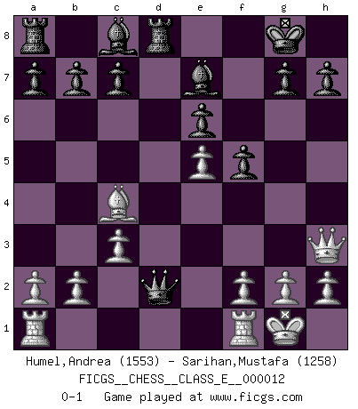 Last move : 0-1 2007 February 2 14:37:22 [Event "FICGS__CHESS__CLASS_E__000012"] [Site "FICGS"] [Date "2006.09.10"] [Round "1"] [White "Humel,Andrea"] [Black "Sarihan,Mustafa"] [Result "0-1"] [WhiteElo "1553"] [BlackElo "1258"] 1.d4 Nf6 2.Bg5 e6 3.e4 Be7 4.Bxf6 Bxf6 5.e5 Be7 6.Qg4 O-O 7.Bd3 f5 8.Qh5 Nc6 9.c3 Qe8 10.Qh3 d6 11.Nf3 dxe5 12.Nxe5 Nxe5 13.dxe5 Qa4 14.Nd2 Rd8 15.O-O Qd7 16.Bc4 Qxd2 0-1 This chess game has been lost on time (started : 2006.09.10 15:18:36) Trompowsky attack (Ruth, Opovcensky Opening) Kingside Castling by player Black (move 6) Kingside Castling by player White (move 15) Player Black won this chess game. Follow this game move after move (download)Pawns: they are the soul of this game, they alone form the attack and defense. (Philidor) Stil? Ich habe keinen Stil! (Anatoly Karpov) El Ajedrez, como cualquier actividad creativa, solo puede existir a través del esfuerzo combinado de aquellos que tienen talento creativo y de aquellos que poseen la habilidad de organizar su trabajo creativo. (Mikhail Botvinnik) Seul un grand joueur sait à quel point il joue faiblement. (Xavier Tartacover) Being number two sucks. (Andre Agassi)