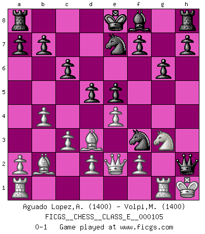 Last move : 0-1 2009 July 11 15:4:56 [Event "FICGS__CHESS__CLASS_E__000105"] [Site "FICGS"] [Date "2009.05.01"] [Round "1"] [White "Aguado Lopez,Antonio"] [Black "Volpi,Matteo"] [Result "0-1"] [WhiteElo "1400"] [BlackElo "1400"] 1.e4 e5 2.Nf3 Nc6 3.Nc3 d6 4.Bc4 Bg4 5.O-O Nd4 6.b3 c6 7.Bb2 Bxf3 8.gxf3 Qg5+ 9.Kh1 Qf4 10.Ne2 Qh4 11.Ng3 g6 12.c3 Ne6 13.b4 Ne7 14.Rg1 d5 15.Bd3 Ng5 16.Qe1 Nxf3 17.Qe2 Qxh2+ 0-1 Three knights game Kingside Castling by player White (move 5) Player Black won this chess game. Follow this game move after move (download)What is the object of playing a gambit opening?... To acquire a reputation of being a dashing player at the cost of losing a game. (Siegbert Tarrasch) Schach ist gnadenlos. Du mußt bereit sein zu töten. (Nigel Short) Cuando tengo las piezas blancas, yo gano porque soy blanco; Cuando tengo las piezas negras, yo gano porque soy Bogolyubov. (Bogolyubov) Tout change constamment, y compris dans le monde des Echecs. (Botvinnik) Better than a thousand days of diligent study is one day with a great teacher. (Japanese proverb)