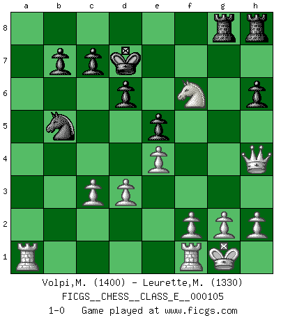 Last move : 1-0 2009 June 4 13:13:15 [Event "FICGS__CHESS__CLASS_E__000105"] [Site "FICGS"] [Date "2009.05.01"] [Round "1"] [White "Volpi,Matteo"] [Black "Leurette,Marc-Antoine"] [Result "1-0"] [WhiteElo "1400"] [BlackElo "1330"] 1.e4 e5 2.Nf3 Nc6 3.Nc3 Nf6 4.d3 Bc5 5.Bg5 d6 6.Be2 h6 7.Bxf6 gxf6 8.O-O Bg4 9.Nd2 Bxe2 10.Qxe2 Qd7 11.Nd5 Nb4 12.Nxf6+ Ke7 13.Nxd7 Kxd7 14.c3 Nc6 15.Qg4+ Ke7 16.b4 Bb6 17.Nc4 Rag8 18.Qh4+ f6 19.a4 a6 20.b5 axb5 21.axb5 Na7 22.Nxb6 Nxb5 23.Nd5+ Kd7 24.Nxf6+ 1-0 Four knights game Kingside Castling by player White (move 8) Player White won this chess game. Follow this game move after move (download)For surely of all the drugs in the world, Chess must be the most permanently pleasurable. (Assiac) Zum Sieg gelangt man nicht, wenn man gut, sondern nur wenn man besser spielt (Savielly Grigorievitsch Tartakower) Un jugador que trata de regresar una movida en el Ajedrez es un futuro carterista. (Richard Fenton) On peut tirer plus d'utilité d'une partie perdue que de 100 parties gagnées. (Capablanca) The real danger is not that computers will begin to think like men, but that men will begin to think like computers. (Sydney J. Harris)