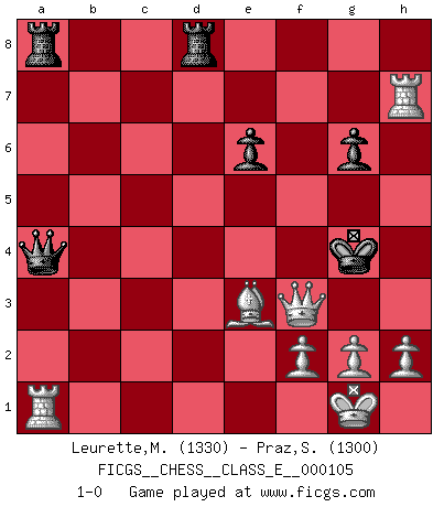 Last move : 1-0 2009 May 23 21:37:5 [Event "FICGS__CHESS__CLASS_E__000105"] [Site "FICGS"] [Date "2009.05.01"] [Round "1"] [White "Leurette,Marc-Antoine"] [Black "Praz,Sylvain"] [Result "1-0"] [WhiteElo "1330"] [BlackElo "1300"] 1.e4 c6 2.d4 d5 3.exd5 cxd5 4.c4 Nf6 5.Nc3 Bf5 6.Bd3 Bxd3 7.Qxd3 e6 8.Nf3 g6 9.O-O Bg7 10.Re1 Nc6 11.cxd5 Nxd5 12.Nxd5 O-O 13.Nc3 Nxd4 14.Rd1 Nxf3+ 15.Qxf3 Qa5 16.Qxb7 Bxc3 17.bxc3 Qxc3 18.Bb2 Qc2 19.Bd4 Rfd8 20.Rdc1 Qd2 21.Bxa7 Kg7 22.a4 Qa5 23.Rc7 Qxa4 24.Rxf7+ Kh6 25.Be3+ Kh5 26.Rxh7+ Kg4 27.Qf3+ 1-0 Caro-Kann : Panov-Botvinnik attack Kingside Castling by player White (move 9) Kingside Castling by player Black (move 12) Player White won this chess game. Follow this game move after move (download)Chess, like love, like music, has the power to make people happy. (Siegbert Tarrasch) Als ich elf wurde, wurde ich einfach gut. (Robert James Fischer) El Ajedrez, como la música, como el amor, tiene el poder de hacer feliz a la gente. (Siegbert Tarrasch) Les échecs, c'est la lutte contre l'erreur. (Johannes Zukertort) The Movers & Shakers of this world are those who play chess in the mornings and go to the disco in the evenings. (Dinesh De Silva)