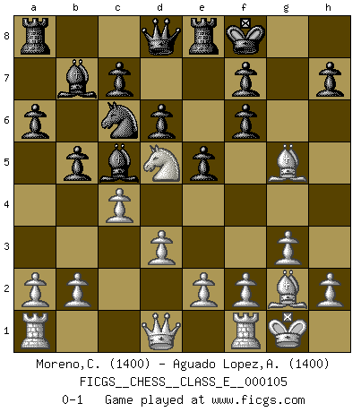 Last move : 0-1 2009 August 26 21:31:27 [Event "FICGS__CHESS__CLASS_E__000105"] [Site "FICGS"] [Date "2009.05.01"] [Round "1"] [White "Moreno,Ciro"] [Black "Aguado Lopez,Antonio"] [Result "0-1"] [WhiteElo "1400"] [BlackElo "1400"] 1.c4 e5 2.Nc3 Nc6 3.g3 Nf6 4.d3 Bc5 5.Bg2 O-O 6.Bg5 a6 7.Nf3 Re8 8.O-O d6 9.Nd5 b5 10.Nd2 Bb7 11.Ne4 Kf8 12.Nexf6 gxf6 0-1 English : Sicilian Reversed Kingside Castling by player Black (move 5) Kingside Castling by player White (move 8) Player Black won this chess game. Follow this game move after move (download)Chess is not like life... it has rules ! (Mark Pasternak) Wenn Capablanka heute auf der Schachbühne erscheinen würde, hätte er ein halbes Jahr gebraucht um sich die Schachtheorie anzueignen. Und dann hätte er alles und jeden besiegt. (Mikhail Moiseyevich Botvinik) Yo he agregado estos principios a la ley: pongan los Caballos en acción antes de que los dos Alfiles sean desarrollados. (Emanuel Lasker) Un footballeur joue avec ses pieds, parfois avec sa tête. Un joueur d'échecs ne joue qu'avec sa tête. Et quand il ne joue plus, il meurt. (Jacob Murray) Players are not good because they find tactics, it is about the way to find the positions in which those tactics are hidden. (Luc-Olivier Leclerc)