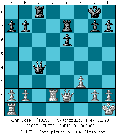 Last move : 1/2-1/2 2009 May 10 15:49:33 [Event "FICGS__CHESS__RAPID_A__000063"] [Site "FICGS"] [Date "2009.05.01"] [Round "1"] [White "Riha,Josef"] [Black "Skwarczylo,Marek"] [Result "1/2-1/2"] [WhiteElo "1989"] [BlackElo "1979"] 1.e4 c5 2.Nf3 d6 3.Nc3 e5 4.Bc4 Be7 5.d3 Nf6 6.Be3 O-O 7.O-O Nc6 8.Nd5 Nd4 9.c3 Nxf3+ 10.Qxf3 Nxd5 11.Bxd5 Be6 12.Bxe6 fxe6 13.Qg4 Qd7 14.d4 exd4 15.cxd4 Rf6 16.Qe2 Raf8 17.Rfd1 Qc6 18.f3 d5 19.Bg5 R6f7 20.Bxe7 Rxe7 21.exd5 Qxd5 22.dxc5 Qxc5+ 23.Kh1 Rc8 24.Rd2 Qc4 1/2-1/2 Sicilian Kingside Castling by player Black (move 6) Kingside Castling by player White (move 7) This chess game ended in a draw. Follow this game move after move (download)To avoid losing a piece, many a person has lost the game. (Savielly Tartakover) Schach ist das schnellste Spiel der Welt, weil man in jeder Sekunde Tausende von Gedanken ordnen muß. (Albert Einstein) La caracteristica mas importante en la posición del Ajedrez es la actividad de las piezas. Esto es absolutamente fundamental en todas las fases del juego: Apertura, Juego Medio y especialmente Finales. La limitación primordial en la actividad de una pieza, es la estructuración de los Peones. (Michael Stean) C'est une question de caractère, Beaucoup de gens perdent leur motivation très vite. D'autres, ils sont rares, peuvent la conserver très longtemps. J'aime les échecs, encore aujourd'hui je suis heureux d'analyser des parties. J'aime toujours gagner, je déteste encore perdre. Bien jouer est important pour mon intégrité intellectuelle et morale. Et puis les échecs vivent en ce moment une période historique grâce à Internet. Ils se développent dans les systèmes éducatifs à travers le monde. Ils sortent de leur ghetto, et c'est mon rôle de mener à bien cette révolution. (Gary Kasparov) Lamb in skin of tiger, still fears the wolf. (Chinese proverb)