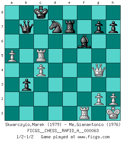 Last move : 1/2-1/2 2009 June 26 17:19:18 [Event "FICGS__CHESS__RAPID_A__000063"] [Site "FICGS"] [Date "2009.05.01"] [Round "1"] [White "Skwarczylo,Marek"] [Black "Me,Gianantonio"] [Result "1/2-1/2"] [WhiteElo "1979"] [BlackElo "1976"] 1.d4 Nf6 2.Nf3 d5 3.c4 e6 4.Nc3 c6 5.e3 Nbd7 6.Bd3 dxc4 7.Bxc4 b5 8.Bd3 Bb7 9.O-O a6 10.e4 c5 11.d5 Qc7 12.dxe6 fxe6 13.Bc2 Bd6 14.Ng5 Nf8 15.f4 O-O-O 16.Qe1 e5 17.Nd5 Bxd5 18.exd5 exf4 19.a4 b4 20.Qe2 c4 21.b3 Be5 22.Rb1 Rxd5 23.bxc4 Bd4+ 24.Kh1 Rxg5 25.Bxf4 Re5 26.Bxe5 Qxe5 27.Qf3 Bc3 28.Qc6+ Qc7 29.Qxa6+ Qb7 30.Qa5 N8d7 31.Bf5 Re8 32.Rbd1 Kb8 33.Bxd7 Nxd7 34.Rd6 Bf6 35.Qf5 Re2 36.Qg4 Re7 37.Rd5 Kc8 38.a5 b3 39.Rc5+ 1/2-1/2 Queen's pawn game Kingside Castling by player White (move 9) Queenside Castling by player Black (move 15) This chess game ended in a draw. Follow this game move after move (download)Bobby is the most misunderstood, misquoted celebrity walking the face of this earth. (Yasser Seirawan) Über Frauen: Chess is better. (Robert James Fischer) El Rey es una pieza de pelea. ¡Usenlo!. (Wilhelm Steinitz) Une platitude souvent récitée à propos des Echecs est qu'une des choses les plus difficiles à réaliser est de gagner une position gagnante. Cela ne manque pas de sens mais, pour ma part, j'ai toujours trouvé plus difficile de gagner une position perdante. (Tim Krabbe) Remember : Your focus determines your reality. (Qui-Gon Jinn in Star Wars ep.1)