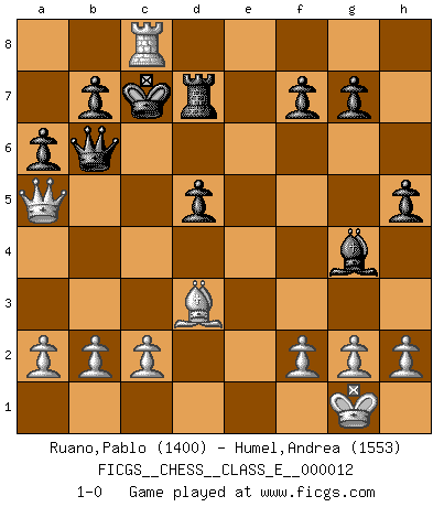 Last move : 1-0 2006 November 14 8:32:20 [Event "FICGS__CHESS__CLASS_E__000012"] [Site "FICGS"] [Date "2006.09.10"] [Round "1"] [White "Ruano,Pablo"] [Black "Humel,Andrea"] [Result "1-0"] [WhiteElo "1400"] [BlackElo "1553"] 1.e4 c5 2.Nf3 e6 3.d4 cxd4 4.Nxd4 a6 5.Nc3 Qc7 6.Bd3 Nc6 7.Be3 Nf6 8.O-O h5 9.Nd5 exd5 10.exd5 Nxd5 11.Re1 Nxe3 12.Rxe3+ Be7 13.Qe2 d5 14.Re1 Bg4 15.Qd2 O-O-O 16.Nxc6 Qxc6 17.Rxe7 Rd7 18.Re8+ Rxe8 19.Rxe8+ Kc7 20.Qa5+ Qb6 21.Rc8+ 1-0 Sicilian : Kan, 5.Nc3 Kingside Castling by player White (move 8) Queenside Castling by player Black (move 15) Player White won this chess game. Follow this game move after move (download)Checkers is for tramps. (Paul Morphy) Weshalb minderdergeübte Spieler mit g2-g4 beginnen? Die betreffenden sind unschlüssig, ob sie nun rechts (h4) oder links (f4) beginnen sollen, und in ihrer Ratlosigkeit entschliessen sie sich nach guter Bürgerart dazu, den goldenen Mittelweg zu wählen. (Aaron Nimzowitsch) ¿Cual es el objetivo de jugar una apertura de gambito?... Para adquirir una reputación de ser un jugador apuesto a costo de perder el juego. (Siegbert Tarrasch) L'ordinateur a tué l'originalité. Il n'y a plus guère d'aventures sur l'échiquier. (Jacob Murray) Nothing is more important for teaching us to understand the concepts we have than constructing fictitious ones. (Ludwig Wittgenstein)