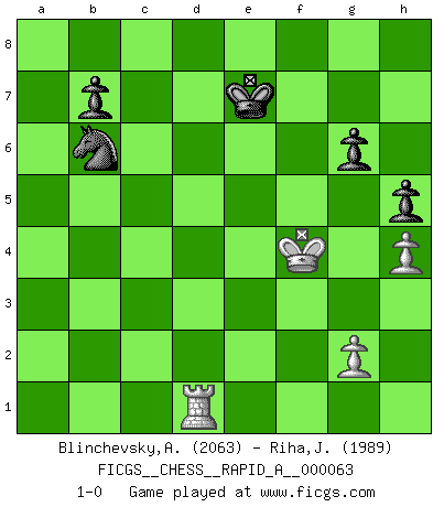 Last move : 1-0 2009 May 23 19:19:6 [Event "FICGS__CHESS__RAPID_A__000063"] [Site "FICGS"] [Date "2009.05.01"] [Round "1"] [White "Blinchevsky,Alexander"] [Black "Riha,Josef"] [Result "1-0"] [WhiteElo "2063"] [BlackElo "1989"] 1.d4 Nf6 2.c4 g6 3.Nc3 Bg7 4.e4 d6 5.Nf3 O-O 6.Be2 e5 7.O-O Nc6 8.d5 Ne7 9.Ne1 Nd7 10.Nd3 f5 11.Bd2 Kh8 12.Rc1 Nf6 13.f3 c5 14.dxc6 Nxc6 15.Be3 Nd4 16.Nf2 Qa5 17.b3 Be6 18.Bd3 Rad8 19.Qe1 Nd7 20.exf5 Nxf5 21.Bg5 Bf6 22.Bd2 Nc5 23.Nd5 Qxa2 24.Nxf6 Nxd3 25.Nxd3 Rxf6 26.Bg5 R6f8 27.Bxd8 Rxd8 28.Rb1 Qa6 29.f4 Qb6+ 30.Rf2 Re8 31.fxe5 Qd4 32.Nf4 Qxe5 33.Re2 Qxf4 34.Re4 Qg5 35.Rxe6 Rf8 36.Qf2 Kg8 37.Rf1 a6 38.Rxd6 Qe7 39.Rd3 h5 40.Rfd1 Rf7 41.Qe1 Qxe1+ 42.Rxe1 Kg7 43.Red1 Kf6 44.Rd7 Re7 45.Rxe7 Kxe7 46.Kf2 Ng7 47.Kf3 Ne6 48.b4 Nd8 49.Ke4 Nc6 50.b5 axb5 51.cxb5 Na7 52.b6 Nc8 53.Kf4 Nxb6 54.h4 1-0 King's Indian : Orthodox, Aronin-Taimanov variation (Yugoslav attack / Mar del Plata variation) Kingside Castling by player Black (move 5) Kingside Castling by player White (move 7) 10 pieces endgame at move 51 : White KRPPP , Black KNPPP WHITE : King + 1 Rook 3 Pawns BLACK : King + 1 Knight 3 Pawns 9 pieces endgame at move 53 : White KRPP , Black KNPPP WHITE : King + 1 Rook 2 Pawns BLACK : King + 1 Knight 3 Pawns Player White won this chess game. Follow this game move after move (download)During a Chess competition a Chessmaster should be a combination of a beast of prey and a monk. (Alexander Alekhine) Ich verachte Kasparow. (Viktor Kortschnoi) Un Peón pasado es un criminal, quién debe ser mantenido bajo candado y llave. Leves medidas, tales como vigilancia policiaca, no son suficientes. (Aaron Nimzovich) Le génie consiste à savoir transgresser les règles au moment opportun. (Teichmann) The project of the man are lower than those of the sky. (Chinese proverb)