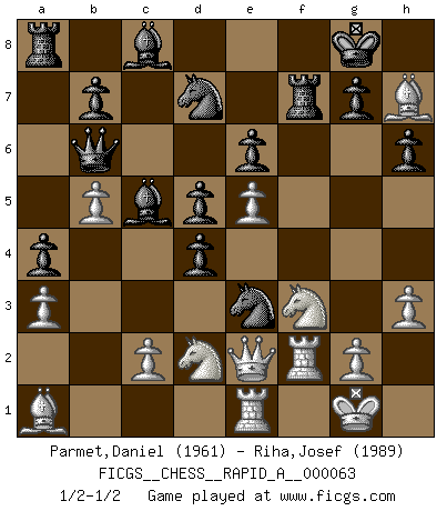 Last move : 1/2-1/2 2009 May 16 21:31:25 [Event "FICGS__CHESS__RAPID_A__000063"] [Site "FICGS"] [Date "2009.05.01"] [Round "1"] [White "Parmet,Daniel"] [Black "Riha,Josef"] [Result "1/2-1/2"] [WhiteElo "1961"] [BlackElo "1989"] 1.e4 e6 2.d4 d5 3.e5 c5 4.b4 cxd4 5.a3 a5 6.b5 Nd7 7.f4 f6 8.Bd3 Nh6 9.Nf3 fxe5 10.fxe5 Ng4 11.Qe2 Bc5 12.O-O O-O 13.Nbd2 Ne3 14.Rf2 a4 15.h3 Qb6 16.Bb2 h6 17.Re1 Rf4 18.Ba1 Rf7 19.Bh7+ 1/2-1/2 French : Advance variation Kingside Castling by player White (move 12) Kingside Castling by player Black (move 12) This chess game ended in a draw. Follow this game move after move (download)Winning isn't everything... but losing is nothing. (Mednis) Obendrein hat der FIDE-Präsident den Revolutionsführer Gaddafi zum »Großmeister« ernannt, am Ende der WM. Das ist lächerlich! (Joel Lautier) El Jaque al descubierto es el bombardero del tablero. (Reuben Fine) Il (Jacob Murray) ne joue pas pour le bon coup, mais pour le meilleur. (Eloi Relange) No, I am still playing. (Anatoly Karpov)