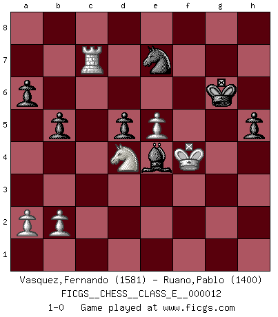 Last move : 1-0 2007 September 13 2:7:27 [Event "FICGS__CHESS__CLASS_E__000012"] [Site "FICGS"] [Date "2006.09.10"] [Round "1"] [White "Vasquez,Fernando"] [Black "Ruano,Pablo"] [Result "1-0"] [WhiteElo "1581"] [BlackElo "1400"] 1.e4 c5 2.d4 cxd4 3.c3 dxc3 4.Nxc3 Nf6 5.e5 Ng8 6.Nf3 Nc6 7.Bf4 f6 8.Bc4 e6 9.O-O a6 10.Ne4 b5 11.Bd3 f5 12.Ned2 d5 13.Nb3 Nge7 14.Bg5 h6 15.Bd2 Ng6 16.Re1 Qb6 17.Rc1 Kf7 18.h4 Nge7 19.h5 Bb7 20.Be3 Qc7 21.Bc5 Rc8 22.g4 g6 23.hxg6+ Nxg6 24.gxf5 Nf4 25.fxe6+ Ke8 26.Kh2 Rg8 27.e7 Bxe7 28.Bf5 Bxc5 29.Nxc5 Rg2+ 30.Kh1 Qg7 31.Bd7+ Kf7 32.Bh3 Ne7 33.Ne6 Nxh3 34.Nxg7 Nxf2+ 35.Kxg2 Nxd1 36.Rexd1 Kxg7 37.Rxc8 Bxc8 38.Rc1 Bf5 39.Nd4 Be4+ 40.Kg3 Kg6 41.Kf4 h5 42.Rc7 1-0 This chess game has been lost on time (started : 2006.09.10 15:18:36) Sicilian : Smith-Morra gambit Kingside Castling by player White (move 9) Player White won this chess game. Follow this game move after move (download)You have to have the fighting spirit. You have to force moves and take chances. (Bobby Fischer) Rubinstein ist ein Turmendspiel, welches die Götter vor tausenden von Jahren begannen. (Savielly Grigorievitsch Tartakower) No soy una persona materialista y por eso, no resiento la falta o pérdida del dinero. La ausencia de cosas mundanas carece de importancia. Ya que el Ajedrez es una forma en la que puedo ser tan materialista como yo desee sin tener la necesidad de vender mi alma. (Jamie Walter Adams) Ce qui est bien, c'est d'avoir tout un tas de pièces en prise : l'adversaire ne peut en prendre qu'une à la fois. Cité par Thierry Audin. Creativity involves breaking out of established patterns in order to look at things in a different way. (Edward De Bono)