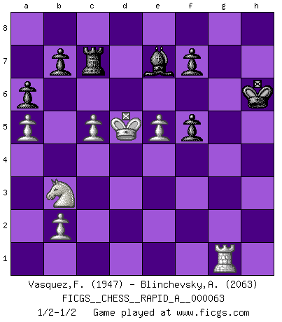 Last move : 1/2-1/2 2009 August 30 2:26:3 [Event "FICGS__CHESS__RAPID_A__000063"] [Site "FICGS"] [Date "2009.05.01"] [Round "1"] [White "Vasquez,Fernando"] [Black "Blinchevsky,Alexander"] [Result "1/2-1/2"] [WhiteElo "1947"] [BlackElo "2063"] 1.e4 c6 2.d4 d5 3.e5 Bf5 4.Nf3 e6 5.Be2 c5 6.O-O Nc6 7.Bb5 Bg4 8.Nbd2 Qb6 9.c4 Rd8 10.a4 a6 11.a5 Qc7 12.Bxc6+ Qxc6 13.Qa4 Qxa4 14.Rxa4 cxd4 15.Nxd4 Ne7 16.N2b3 Bh5 17.Bg5 h6 18.Bxe7 Bxe7 19.c5 O-O 20.Rb4 Rb8 21.f4 Bg6 22.Rb6 Bd8 23.Rd6 Be4 24.Kf2 g5 25.g3 Be7 26.Rd7 Rfe8 27.Ke2 Bg6 28.h4 gxh4 29.gxh4 Bxh4 30.Rh1 Be7 31.Rxh6 Bf8 32.Rh1 Re7 33.Rxe7 Bxe7 34.Rg1 Kh7 35.Ke3 Rc8 36.f5 Bxf5 37.Nxf5 exf5 38.Kd4 Kh6 39.Kxd5 Rc7 1/2-1/2 Caro-Kann : Advance variation Kingside Castling by player White (move 6) Kingside Castling by player Black (move 19) This chess game ended in a draw. Follow this game move after move (download)I still hope to kill Fischer. (Boris Spassky) Schach ist gnadenlos. Du mußt bereit sein zu töten. (Nigel Short) Cada Peón es una Reina en potencia. (James Mason) Botvinnik disait en comparant les échecs à la musique: Il existe une science dont le but est l'étude de l'acoustique et des sons. Mais il y a aussi un art qui se sert de l'océan des sons : c'est la musique. De toute évidence, il en est de même pour la pensée. La logique est l'étude des lois de la réflexion et les échecs reflètent, en tant qu'art, le côté logique de la réflexion, sous la forme d'images artistiques... Extrait de Fischer - Spassky, Reykjavik 1972 par Alexander & F. Wyndham (Ed. Solar), p 37. However beautiful the strategy, you should occasionally look at the results. (Winston Churchill)