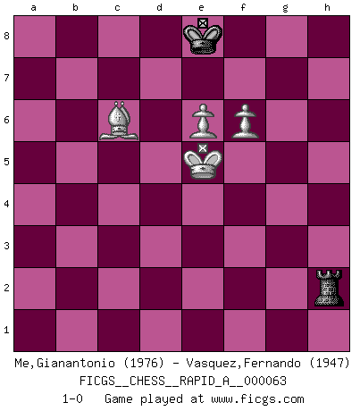 Last move : 1-0 2009 December 18 17:4:39 [Event "FICGS__CHESS__RAPID_A__000063"] [Site "FICGS"] [Date "2009.05.01"] [Round "1"] [White "Me,Gianantonio"] [Black "Vasquez,Fernando"] [Result "1-0"] [WhiteElo "1976"] [BlackElo "1947"] 1.d4 d5 2.c4 dxc4 3.Nf3 Nf6 4.e3 g6 5.Bxc4 Bg7 6.b4 O-O 7.O-O Nbd7 8.Nc3 Nb6 9.Bb3 Bf5 10.Qe2 Ne4 11.Bb2 Qd6 12.Rac1 Nxc3 13.Bxc3 Nd5 14.b5 a6 15.Bd2 Nf6 16.Qc4 axb5 17.Qxc7 Be4 18.Rfd1 Rfd8 19.Qxd6 exd6 20.Rc7 Nd5 21.Rxf7 Kxf7 22.Ng5+ Ke7 23.Nxe4 Nc7 24.f3 Kd7 25.Be1 Ra6 26.Rb1 Rda8 27.Bb4 Re8 28.Kf1 Rc6 29.Bd2 Ra6 30.h4 Kc8 31.Nc3 Bf6 32.g3 Kd7 33.f4 Ra3 34.Rc1 Rea8 35.Kf2 Be7 36.Kf3 Rf8 37.Nd5 Nxd5 38.Bxd5 Bd8 39.h5 gxh5 40.Rb1 Rf5 41.Ke4 Rf6 42.Rh1 Ba5 43.Bxa5 Rxa5 44.Rxh5 h6 45.g4 Ra8 46.f5 Ra3 47.g5 hxg5 48.Rxg5 Rh6 49.Rg4 Ke7 50.Bb3 Ra8 51.Kf4 Rf8 52.Kg5 Rfh8 53.f6+ Kf8 54.e4 Rh1 55.Kf5 R8h5+ 56.Ke6 R1h4 57.Rxh4 Rxh4 58.Bd5 Rf4 59.e5 dxe5 60.dxe5 Ke8 61.Bxb7 Rf2 62.Bc6+ Kf8 63.a3 Rf1 64.Bxb5 Ra1 65.Bc6 Rxa3 66.Kd6 Kf7 67.Bd5+ Ke8 68.e6 Re3 69.Bc6+ Kf8 70.Bg2 Ke8 71.Bd5 Re2 72.Bf3 Rd2+ 73.Ke5 Rh2 74.Bc6+ 1-0 QGA, Smyslov variation Kingside Castling by player Black (move 6) Kingside Castling by player White (move 7) 10 pieces endgame at move 59 : White KBPPP , Black KRPPP WHITE : King + 1 Bishop 3 Pawns BLACK : King + 1 Rook 3 Pawns 9 pieces endgame at move 60 : White KBPPP , Black KRPP WHITE : King + 1 Bishop 3 Pawns BLACK : King + 1 Rook 2 Pawns 8 pieces endgame at move 61 : White KBPPP , Black KRP WHITE : King + 1 Bishop 3 Pawns BLACK : King + 1 Rook 1 Pawn 7 pieces endgame at move 64 : White KBPPP , Black KR WHITE : King + 1 Bishop 3 Pawns BLACK : King + 1 Rook 6 pieces endgame at move 65 : White KBPP , Black KR WHITE : King + 1 Bishop 2 Pawns BLACK : King + 1 Rook Player White won this chess game. Follow this game move after move (download)No price is too great for the scalp of the enemy King. (Koblentz) Gewinnen beim Schach fördert das Selbstvertrauen. Beim Sex spüre ich sowas nicht... (Garry Kasparov) Solo puedes ser bueno en el Ajedrez si amas al juego. (Bobby Fischer) Les échecs sont plus proches de l'art de l'assassinat que de l'art de la guerre. (Arturo Perez-Reverte) Now the reason the enlightened prince and the wise general conquer the enemy whenever they move and their achievements surpass those of ordinary men is foreknowledge. (Sun Tzu)