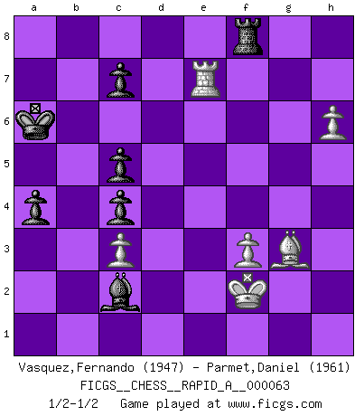 Last move : 1/2-1/2 2009 October 5 16:31:20 [Event "FICGS__CHESS__RAPID_A__000063"] [Site "FICGS"] [Date "2009.05.01"] [Round "1"] [White "Vasquez,Fernando"] [Black "Parmet,Daniel"] [Result "1/2-1/2"] [WhiteElo "1947"] [BlackElo "1961"] 1.e4 e5 2.Nf3 Nc6 3.d4 exd4 4.Nxd4 Bc5 5.Nxc6 Qf6 6.Qf3 dxc6 7.Nc3 Be6 8.Be3 Bb4 9.Qxf6 Nxf6 10.f3 Rd8 11.a3 Bxc3+ 12.bxc3 O-O 13.Be2 Ne8 14.Kf2 Nd6 15.g4 f6 16.Rhd1 b6 17.a4 a5 18.h4 Rd7 19.Bd4 c5 20.Be3 Rfd8 21.Bf4 Kf7 22.Rd3 Kf8 23.Rh1 Kf7 24.Re1 Kf8 25.Kg3 h6 26.g5 h5 27.Kf2 Rb8 28.Rg1 Rbd8 29.gxf6 gxf6 30.Rg6 Kf7 31.Rg3 Rg8 32.Rxg8 Kxg8 33.Rd1 Kf7 34.Rg1 Rd8 35.Bh2 Rg8 36.Re1 Rd8 37.e5 fxe5 38.Bxe5 Rd7 39.Bd3 Bd5 40.Rg1 Bc6 41.Bg6+ Ke6 42.Re1 Rd8 43.Bg7 Kd7 44.Bxh5 Bxa4 45.Bf6 Rg8 46.Re7+ Kc6 47.Bg4 Bxc2 48.Bd7+ Kb7 49.h5 Rf8 50.Bg7 Rd8 51.Be5 Nc4 52.Bf4 Rf8 53.Bg3 Ka6 54.h6 a4 55.Be6 b5 56.Bxc4 bxc4 1/2-1/2 Scotch game Kingside Castling by player Black (move 12) This chess game ended in a draw. Follow this game move after move (download)Chess is like life. (Boris Spassky) Nach Morphy wurde nichts neues mehr in der Behandlung offener Positionen gefunden. (Mikhail Moiseyevich Botvinik) Las combinaciones han sido siempre el aspecto más intrigante del Ajedrez. Los Maestros las buscan, el público las aplauden, los críticos las alaban. La razón se debe a que las combinaciones hacen posible que el Ajedrez sea más que un ejercicio matemático con una carencia de vida. Ellas son la poesía del juego, son del Ajedrez lo que la melodía es de la música. Ellas representan el triunfo de la mente sobre la materia. (Reuben Fine) La menace est plus forte que l'exécution. (Aaron Nimzovitch) Hardware: the parts of a computer that can be kicked. (Jeff Persis)