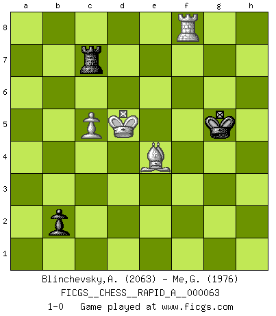 Last move : 1-0 2009 November 22 23:35:40 [Event "FICGS__CHESS__RAPID_A__000063"] [Site "FICGS"] [Date "2009.05.01"] [Round "1"] [White "Blinchevsky,Alexander"] [Black "Me,Gianantonio"] [Result "1-0"] [WhiteElo "2063"] [BlackElo "1976"] 1.d4 Nf6 2.c4 e6 3.Nf3 d5 4.Nc3 c6 5.e3 Nbd7 6.Qc2 Bd6 7.g4 dxc4 8.Bxc4 e5 9.g5 Nd5 10.Bd2 exd4 11.Qe4+ Ne7 12.Qxd4 Nf5 13.Qe4+ Ne7 14.Qc2 Nb6 15.Be2 O-O 16.Ne4 Bf5 17.O-O-O Bc7 18.Bd3 Qd5 19.Bc3 Rfe8 20.h4 Rad8 21.h5 Qxa2 22.Nf6+ gxf6 23.Bxf5 Qa1+ 24.Qb1 Qxb1+ 25.Bxb1 Rxd1+ 26.Rxd1 f5 27.Bb4 Nbd5 28.Ba3 a5 29.Nh4 f4 30.e4 Nb4 31.Bxb4 axb4 32.Rd7 Bb6 33.Ba2 Kf8 34.f3 Ra8 35.Bb3 Ke8 36.Rxb7 Be3+ 37.Kc2 Ra5 38.Nf5 Nxf5 39.Bxf7+ Kf8 40.exf5 Rxf5 41.g6 hxg6 42.Bxg6 Rg5 43.Kd3 c5 44.Ke4 Kg8 45.b3 Kh8 46.Rf7 Kg8 47.Rc7 Kf8 48.Rd7 Kg8 49.Kd3 Kh8 50.Kc4 Kg8 51.Kb5 Bd4 52.Rf7 Rg3 53.Kc6 Rh3 54.Kd6 Rg3 55.Ke6 Rg5 56.Rxf4 Re5+ 57.Kd7 Rd5+ 58.Kc6 Rd8 59.h6 Be3 60.h7+ Kg7 61.Rg4 Bd4 62.f4 Rf8 63.Kd7 Kh8 64.Ke7 Rc8 65.Be4 c4 66.bxc4 b3 67.f5 Kxh7 68.f6 Kh6 69.f7 Rc7+ 70.Ke6 Bc5 71.Rg6+ Kh5 72.Rg7 Bf8 73.Rg8 Bc5 74.Kd5 b2 75.f8Q Bxf8 76.Rxf8 Kg5 77.c5 1-0 Queen's pawn game Kingside Castling by player Black (move 15) Queenside Castling by player White (move 17) 10 pieces endgame at move 66 : White KRBPPP , Black KRBP WHITE : King + 1 Rook 1 Bishop 3 Pawns BLACK : King + 1 Rook 1 Bishop 1 Pawn 9 pieces endgame at move 67 : White KRBPP , Black KRBP WHITE : King + 1 Rook 1 Bishop 2 Pawns BLACK : King + 1 Rook 1 Bishop 1 Pawn Promotion Queen by player White (move 75) 8 pieces endgame at move 75 : White KRBP , Black KRBP WHITE : King + 1 Rook 1 Bishop 1 Pawn BLACK : King + 1 Rook 1 Bishop 1 Pawn 7 pieces endgame at move 76 : White KRBP , Black KRP WHITE : King + 1 Rook 1 Bishop 1 Pawn BLACK : King + 1 Rook 1 Pawn Player White won this chess game. Follow this game move after move (download)By the beauty of his games, the clarity of his play, and the brilliance of his ideas, Fischer made himself an artist of the same stature as Brahms, Rembrandt, and Shakespeare. (David Levy) Pläne sind die Träume des Verständigen. (Ernst Freiherr von Feuchtersleben) Todavía soy una víctima del Ajedrez. Tiene toda la belleza del arte y mucho mas. No puede ser comercializado. El Ajedrez es mas puro que el arte en su posición social. (Marcel Duchamp) On a dit que l'homme se distingue de l'animal par le fait qu'il achète plus de livres qu'il ne peut en lire. Je voudrais suggérer qu'inclure à la liste des livres quelques livres d'échecs rendrait la distinction manifeste. (Edward Lasker) Indecision is the key to flexibility. (Unknown)
