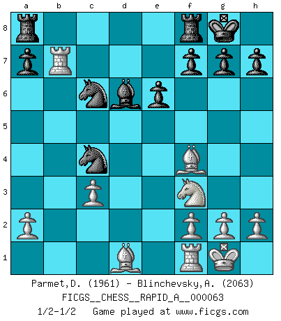 Last move : 1/2-1/2 2009 May 22 15:30:26 [Event "FICGS__CHESS__RAPID_A__000063"] [Site "FICGS"] [Date "2009.05.01"] [Round "1"] [White "Parmet,Daniel"] [Black "Blinchevsky,Alexander"] [Result "1/2-1/2"] [WhiteElo "1961"] [BlackElo "2063"] 1.e4 c6 2.d4 d5 3.e5 Bf5 4.Nf3 e6 5.Be2 Nd7 6.O-O Ne7 7.Nh4 c5 8.Bg5 Be4 9.Nc3 cxd4 10.Nxe4 dxe4 11.Qxd4 Nc6 12.Qe3 Bc5 13.Qf4 Qb6 14.Qxe4 Ndxe5 15.Bf4 Qxb2 16.Rab1 Qd4 17.Qxd4 Nxd4 18.Bd1 Nc4 19.c3 Nc6 20.Rxb7 O-O 21.Nf3 Bd6 1/2-1/2 Caro-Kann : Advance variation Kingside Castling by player White (move 6) Kingside Castling by player Black (move 20) This chess game ended in a draw. Follow this game move after move (download)Bobby just drops the pieces and they fall on the right squares. (Miguel Najdorf) Je mehr wir mit Computern analysieren, desto mehr glauben wir an Verteidigung. (Vladimir Kramnik) Un entendimiento a fondo de las continuaciones típicas del mate, hace de las combinaciones de sacrificio mas complicadas conducirlas a ellas no solo sin dificultad, sino casi de una manera natural. (Siegbert Tarrasch) Les Echecs mettent en conflit, non pas deux intelligences, mais deux volontés. (Lasker) They say in chess you've got to kill the queen, and then you mate it... Oh I, do you ? (Red Hot Chili Peppers, Fortune faded)