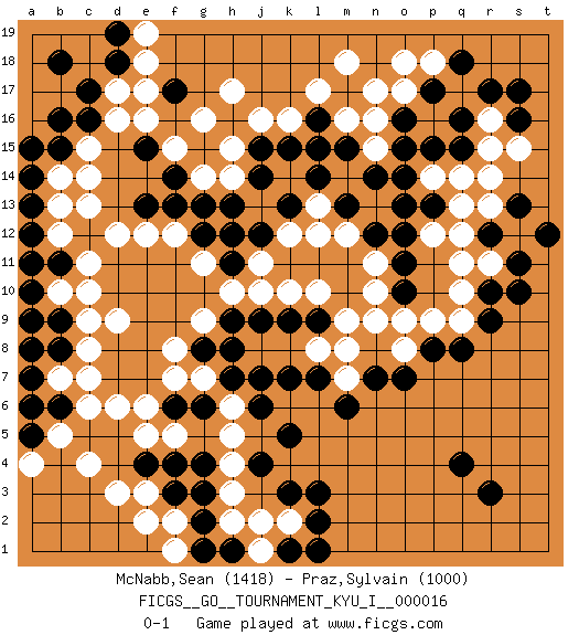Last move : 0-1 2009 October 25 19:29:40 [Event "FICGS__GO__TOURNAMENT_KYU_I__000016"] [Site "FICGS"] [Date "2009.05.01"] [Round "1"] [Black "McNabb,Sean"] [White "Praz,Sylvain"] [Result "0-1"] [Rating 1 "1418"] [Rating 2 "1000"] 1.q16 c4 2.q4 d16 3.e4 e3 4.f3 d3 5.f4 d6 6.k3 d9 7.f17 c13 8.m17 r14 9.r12 p14 10.r9 o17 11.o16 n16 12.o15 n17 13.p17 n15 14.o14 r16 15.q15 r15 16.r17 s12 17.s11 q14 18.s16 s15 19.s17 q12 20.s13 h17 21.c17 d17 22.c16 c15 23.d18 e18 24.b18 e17 25.b15 c14 26.d19 e19 27.o12 q11 28.o10 r13 29.t12 r11 30.s10 q9 31.q8 p9 32.p8 o9 33.n7 n10 34.o11 n9 35.m13 l15 36.k13 l10 37.l7 j10 38.j7 g9 39.j15 j16 40.k15 k16 41.l14 g7 42.m15 m16 43.l16 l17 44.l15 m18 45.g13 f12 46.g12 g11 47.f13 e12 48.r3 j13 49.j12 h14 50.j14 h15 51.h13 f15 52.f6 h5 53.g6 h6 54.h7 h3 55.g2 h2 56.k5 f7 57.j4 h4 58.j6 e6 59.g4 k2 60.l2 j2 61.l3 e2 62.h1 f2 63.g3 f1 64.g1 e5 65.k1 j1 66.l1 f5 67.h11 h10 68.e13 d12 69.g15 g14 70.f14 g16 71.n14 o8 72.o7 p18 73.q18 o18 74.r10 q10 75.e15 e16 76.b16 j11 77.a12 b12 78.a13 b13 79.a14 a11 80.b11 b10 81.a10 a9 82.b9 a11 83.p13 p12 84.a10 c10 85.a8 c11 86.a11 c8 87.b6 b7 88.a7 b5 89.a5 a4 90.a6 c6 91.k9 k10 92.j9 l12 93.b8 c9 94.a9 b14 95.a15 c7 96.h9 l13 97.g8 f8 98.h8 k12 99.h12 m12 100.n12 m8 101.o13 q13 102.p15 m7 103.m6 l8 104.k7 n11 105.l9 m9 0-1 Here are the names of the openings (joseki) played in the four corners : Corner d4 : c4 e4 Komoku (Somok, Xiao~mu`) 3-4 Point. The komoku (3-4) point is the traditional corner enclosure move.. Ikken Takagakari (Hankan Nop'dakeolch'im, Yi Gaogua`jiao~, 1-Space High Approach). The 5-4 approach move has become more popular in modern times, as modern Go emphasizes speed and influence. Corner d16 : d16 f17 Hoshi (Hwajeom, Seongjeom, Xingwei`) 4-4 Point. The star or hoshi (4-4) point, emphasizing influence at the potential expense of territory. Ikken Kakari (Hankan Keolch'im, Yi Gua`jiao~, 1-Space Low Approach). Black 2 is the standard approach move to the 4-4. Player White won this Go (weiqi, baduk) game. Follow this game move after move (download)The enemy's vital point is your own. (Anonymous) There are more things in heaven and earth than practically anywhere else. (Unknown)