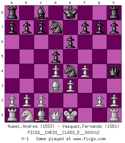 Last move : 0-1 2006 October 30 8:59:6 [Event "FICGS__CHESS__CLASS_E__000012"] [Site "FICGS"] [Date "2006.09.10"] [Round "1"] [White "Humel,Andrea"] [Black "Vasquez,Fernando"] [Result "0-1"] [WhiteElo "1553"] [BlackElo "1581"] 1.d4 d5 2.Nf3 Nf6 3.e3 e6 4.Ne5 Nbd7 5.f4 Ne4 6.Nf3 Be7 7.Bd3 Bh4+ 8.Nxh4 Qxh4+ 0-1 Queen's pawn game Player Black won this chess game. Follow this game move after move (download)Chess, like love, is infectious at any age. (Flohr) Frage: Was machen Sie mit den Preisen? Anwort: Ich habe Angst, dass meine Freundin davon neue Kleider kauft. (Loek van Wely) El Ajedrez es despiadado: debes de estar preparado para matar gente. (Nigel Short) Vouloir jouer aux échecs contre soi-même est aussi paradoxal que vouloir marcher sur son ombre. (Stefan Zweig) Coffee just isn't my cup of tea. (Unknown)