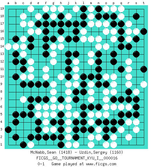 Last move : 0-1 2009 October 26 7:33:54 [Event "FICGS__GO__TOURNAMENT_KYU_I__000016"] [Site "FICGS"] [Date "2009.05.01"] [Round "1"] [Black "McNabb,Sean"] [White "Uzdin,Sergey"] [Result "0-1"] [Rating 1 "1418"] [Rating 2 "1160"] 1.q16 d4 2.q4 d16 3.f17 c14 4.l17 o17 5.p17 o16 6.q14 f3 7.c9 c7 8.c12 r6 9.r8 r4 10.r3 q3 11.r5 s4 12.q5 r2 13.p3 s3 14.s5 p2 15.o3 r10 16.p12 r12 17.s13 s8 18.r7 r9 19.s7 p10 20.n12 m15 21.k15 m13 22.k3 m12 23.n11 p8 24.n9 q6 25.p7 p6 26.s6 o5 27.o4 o7 28.q7 o8 29.k13 o14 30.l10 k12 31.j12 k11 32.j13 k10 33.d18 c17 34.f15 m7 35.l9 c18 36.k7 k5 37.l6 j3 38.k4 j4 39.l5 h10 40.h7 f10 41.e9 d11 42.c11 d10 43.d9 g8 44.e7 g7 45.f5 h6 46.c5 c4 47.d5 g14 48.f14 g13 49.g15 h14 50.j15 e6 51.d6 e5 52.d7 j5 53.k2 j2 54.e4 f6 55.e3 c2 56.b4 b3 57.b5 d3 58.d2 c3 59.f2 f4 60.e2 g3 61.a3 f11 62.c1 e18 63.f18 m18 64.l18 r17 65.p18 r15 66.q15 r16 67.r14 q18 68.s15 s16 69.q11 r11 70.p13 q19 71.s18 p19 72.o18 o19 73.n18 t9 74.n6 o6 75.t11 n5 76.m6 m4 77.l4 n2 78.m3 n3 79.n4 m5 80.o2 o1 81.p4 m2 82.l3 m8 83.n1 m1 84.k8 k1 85.b15 b14 86.d15 c15 87.d14 d19 88.g2 m17 89.n19 p1 90.h1 j1 91.b13 a14 92.n16 n17 93.m16 l16 94.k16 l15 95.h3 g5 96.h2 m19 97.k17 j7 98.e17 d17 99.h4 m9 100.m10 o10 101.n10 k9 102.l8 j8 103.t16 c13 104.b12 d12 105.g4 f5 106.h5 j6 107.f7 g6 108.n13 n14 109.f13 g12 110.f9 g9 111.j11 e16 112.f16 j18 113.l19 f19 114.g19 g18 115.e19 p16 116.q17 f19 117.o15 n15 118.e19 h15 119.h16 f19 120.g17 h19 121.j17 h17 122.h18 c10 123.b10 h17 124.o9 p9 125.h18 d1 126.b2 h17 127.j10 j9 128.h18 g19 129.h17 p15 130.j19 k19 0-1 Here are the names of the openings (joseki) played in the four corners : Corner d16 : d16 f17 Hoshi (Hwajeom, Seongjeom, Xingwei`) 4-4 Point. The star or hoshi (4-4) point, emphasizing influence at the potential expense of territory. Ikken Kakari (Hankan Keolch'im, Yi Gua`jiao~, 1-Space Low Approach). Black 2 is the standard approach move to the 4-4. Corner q4 : q4 r6 Hoshi (Hwajeom, Seongjeom, Xingwei`) 4-4 Point. The star or hoshi (4-4) point, emphasizing influence at the potential expense of territory. Ikken Kakari (Hankan Keolch'im, Yi Gua`jiao~, 1-Space Low Approach). White 2 is the standard approach move to the 4-4. Player White won this Go (weiqi, baduk) game. Follow this game move after move (download)Learn to play under the stones. (Anonymous) Over-the-board chess is the favorite of mortals, correspondence chess is the favorite of the gods. (Eduard Dyckhoff)