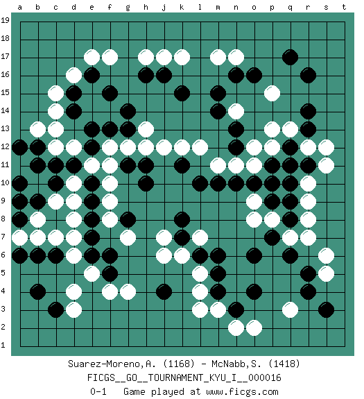 Last move : 0-1 2009 August 11 17:24:28 [Event "FICGS__GO__TOURNAMENT_KYU_I__000016"] [Site "FICGS"] [Date "2009.05.01"] [Round "1"] [Black "Suarez-Moreno,Alejandro"] [White "McNabb,Sean"] [Result "0-1"] [Rating 1 "1168"] [Rating 2 "1418"] 1.q17 d4 2.r4 d16 3.o4 r10 4.r14 r7 5.c10 m3 6.q6 s5 7.s3 o2 8.n3 n2 9.m4 l3 10.o6 k17 11.c6 c12 12.b4 g4 13.d14 c14 14.d15 c15 15.f15 f17 16.e16 e17 17.h16 n17 18.c3 d3 19.q11 s12 20.r11 s11 21.q10 r9 22.r16 p8 23.q8 r8 24.q9 q7 25.p7 o8 26.r5 s6 27.o10 q13 28.r13 r12 29.q12 p13 30.n12 p15 31.o16 n14 32.n16 m17 33.m14 o12 34.n13 o11 35.n10 p10 36.p9 o9 37.p11 p12 38.p10 n11 39.m10 m11 40.l10 l12 41.m15 j12 42.k15 h17 43.j16 j17 44.g13 g12 45.e12 h13 46.g14 f12 47.f13 e11 48.k11 k12 49.h10 d12 50.e13 f10 51.j4 l4 52.m5 l5 53.l6 k6 54.k7 l7 55.m6 j7 56.k8 j6 57.e9 d6 58.e6 d7 59.e7 c7 60.b6 e5 61.g8 q3 62.h11 h12 63.g11 f11 64.d11 d10 65.c11 d9 66.e10 c9 67.b12 c13 68.b9 b8 69.a9 b13 70.a8 b10 71.b11 a7 72.a10 b7 73.a12 f9 74.e8 f8 75.f5 f4 76.a6 d8 77.f6 g7 0-1 Here are the names of the openings (joseki) played in the four corners : Corner d4 : d4 c6 Hoshi (Hwajeom, Seongjeom, Xingwei`) 4-4 Point. The star or hoshi (4-4) point, emphasizing influence at the potential expense of territory. Ikken Kakari (Hankan Keolch'im, Yi Gua`jiao~, 1-Space Low Approach). Black 2 is the standard approach move to the 4-4. Player White won this Go (weiqi, baduk) game. Follow this game move after move (download)Balance is not what players strike for, and if it does arise, it is in spite of them. (Pierre Audouard) When you stop learning you start dying. (M. Scott Adams)