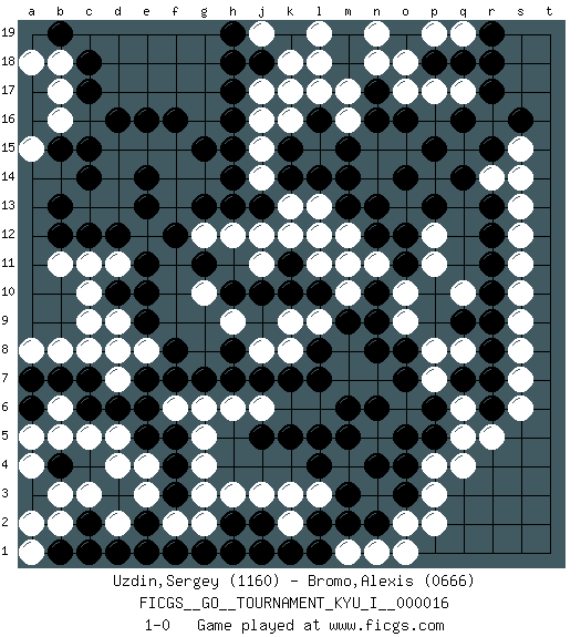 Last move : 1-0 2009 July 17 7:39:22 [Event "FICGS__GO__TOURNAMENT_KYU_I__000016"] [Site "FICGS"] [Date "2009.05.01"] [Round "1"] [Black "Uzdin,Sergey"] [White "Bromo,Alexis"] [Result "1-0"] [Rating 1 "1160"] [Rating 2 "0666"] 1.q16 d4 2.d16 q4 3.c6 c5 4.d6 d5 5.f3 e3 6.f4 e4 7.o3 p3 8.o4 o2 9.n2 p2 10.m3 l3 11.d10 q10 12.r13 k16 13.n17 r14 14.r15 s14 15.q14 s15 16.s16 s13 17.r12 s12 18.r11 s11 19.r10 s10 20.r9 s9 21.r8 s8 22.r6 r5 23.h17 j17 24.h16 j16 25.c14 f15 26.f16 e15 27.e16 d15 28.c15 c13 29.b13 d13 30.c12 b11 31.b12 c11 32.d12 d11 33.e11 c10 34.e13 d14 35.g15 f14 36.g13 f13 37.f12 g14 38.h14 g12 39.e14 d9 40.e10 c9 41.e9 e8 42.e6 b6 43.b7 b5 44.d8 c8 45.c7 d7 46.e7 d8 47.f8 b8 48.a7 a8 49.g7 q6 50.q7 o15 51.m15 l15 52.m14 m16 53.n16 m17 54.m18 l17 55.k15 j15 56.k14 j14 57.j13 k13 58.l14 l13 59.m13 m12 60.n12 m11 61.k11 l12 62.o7 n15 63.o14 n14 64.n13 o13 65.o12 p14 66.p13 p12 67.o14 n11 68.o11 o10 69.p15 p11 70.o16 l18 71.j18 n18 72.m19 n19 73.l16 l19 74.k17 k18 75.h15 k17 76.h18 o18 77.p18 p17 78.q18 j12 79.h13 h12 80.n10 m10 81.n9 m7 82.m9 l9 83.l8 k9 84.j10 k8 85.l7 m8 86.l10 k12 87.k10 j11 88.k7 j8 89.j7 o9 90.n8 n7 91.o8 o6 92.p6 q5 93.p5 p4 94.o5 s6 95.r7 s7 96.l4 k3 97.h2 q17 98.r17 o17 99.h10 h9 100.h8 g10 101.c2 c1 102.d1 b2 103.b1 b3 104.e2 c3 105.a6 a5 106.c1 a2 107.b4 a4 108.f1 h3 109.j2 j3 110.l2 k2 111.k1 g2 112.g1 d2 113.d3 g3 114.h1 f2 115.l1 d2 116.e1 a1 117.j1 n1 118.m2 m4 119.l5 o1 120.n4 m1 121.m5 p8 122.n6 p7 123.m6 g4 124.f5 g5 125.e5 f6 126.f7 g6 127.j5 h6 128.h7 j6 129.k5 j19 130.h19 b17 131.c18 b18 132.c17 b16 133.b19 a18 134.b15 a15 135.pass p19 136.r18 q19 137.r19 q8 138.q9 l11 139.g11 1-0 Here are the names of the openings (joseki) played in the four corners : Corner d4 : d4 c6 Hoshi (Hwajeom, Seongjeom, Xingwei`) 4-4 Point. The star or hoshi (4-4) point, emphasizing influence at the potential expense of territory. Ikken Kakari (Hankan Keolch'im, Yi Gua`jiao~, 1-Space Low Approach). Black 2 is the standard approach move to the 4-4. Corner q4 : q4 o3 Hoshi (Hwajeom, Seongjeom, Xingwei`) 4-4 Point. The star or hoshi (4-4) point, emphasizing influence at the potential expense of territory. Ikken Kakari (Hankan Keolch'im, Yi Gua`jiao~, 1-Space Low Approach). Black 2 is the standard approach move to the 4-4. Player Black won this Go (weiqi, baduk) game. Follow this game move after move (download)Add one stone, then sacrifice both. (Anonymous) Your best chance to get a Royal Flush in a casino is in the bathroom. (Anonymous)