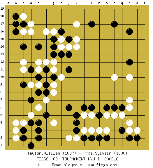 Last move : 0-1 2009 October 11 23:57:18 [Event "FICGS__GO__TOURNAMENT_KYU_I__000016"] [Site "FICGS"] [Date "2009.05.01"] [Round "1"] [Black "Taylor,William"] [White "Praz,Sylvain"] [Result "0-1"] [Rating 1 "1097"] [Rating 2 "1000"] 1.r16 c4 2.q3 d16 3.p17 r10 4.e4 d5 5.c3 d3 6.d4 d2 7.c2 b4 8.e3 b2 9.e2 b3 10.d1 d9 11.k4 n3 12.n5 k2 13.l2 l3 14.m2 m3 15.k3 j2 16.n2 o3 17.o2 o5 18.o6 p5 19.p6 q5 20.q6 m5 21.m6 l5 22.k5 r6 23.l6 r7 24.j6 g4 25.f5 k17 26.r12 p10 27.c14 c12 28.e14 f16 29.c17 c16 30.b16 d17 31.b18 c18 32.b17 r3 33.r2 r4 34.s2 s3 35.m17 k15 36.d7 e6 37.e8 f7 38.f9 e12 39.g14 g12 40.h16 h15 41.g15 g16 42.j15 h14 43.h13 j14 44.j13 k14 45.g13 g11 46.j11 g9 47.g10 e9 48.f8 g8 49.f11 h10 50.e10 f12 51.d11 c11 52.c9 e11 0-1 Here are the names of the openings (joseki) played in the four corners : Corner d4 : c4 e4 Komoku (Somok, Xiao~mu`) 3-4 Point. The komoku (3-4) point is the traditional corner enclosure move.. Ikken Takagakari (Hankan Nop'dakeolch'im, Yi Gaogua`jiao~, 1-Space High Approach). The 5-4 approach move has become more popular in modern times, as modern Go emphasizes speed and influence. Corner q4 : q3 n3 Komoku (Somok, Xiao~mu`) 3-4 Point. The komoku (3-4) point is the traditional corner enclosure move.. Corner d16 : d16 c14 Hoshi (Hwajeom, Seongjeom, Xingwei`) 4-4 Point. The star or hoshi (4-4) point, emphasizing influence at the potential expense of territory. Ikken Kakari (Hankan Keolch'im, Yi Gua`jiao~, 1-Space Low Approach). Black 2 is the standard approach move to the 4-4. Player White won this Go (weiqi, baduk) game. Follow this game move after move (download)Grab the border points between two moyos. (Anonymous) Employ the attack like tactic of defense. (Chinese proverb)