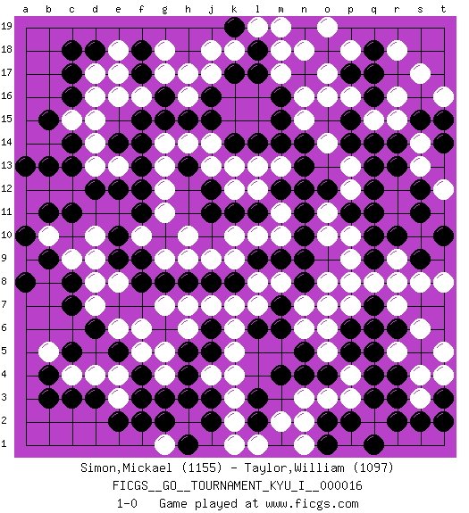 Last move : 1-0 2010 February 1 20:45:55 [Event "FICGS__GO__TOURNAMENT_KYU_I__000016"] [Site "FICGS"] [Date "2009.05.01"] [Round "1"] [Black "Simon,Mickael"] [White "Taylor,William"] [Result "1-0"] [Rating 1 "1155"] [Rating 2 "1097"] 1.q16 d4 2.q4 d16 3.q10 d10 4.f17 h17 5.c17 d17 6.c16 d15 7.d18 e18 8.c18 e17 9.c14 e13 10.c13 o3 11.r6 k4 12.l17 q2 13.r3 o17 14.p17 o16 15.q14 o14 16.l14 p12 17.q12 p10 18.p11 o11 19.q11 o10 20.o12 p13 21.n12 m13 22.m12 l13 23.k14 h14 24.j16 h16 25.n14 n15 26.m14 l12 27.n13 m17 28.m16 m18 29.l18 p18 30.q18 p16 31.q17 o19 32.l11 j13 33.f3 h3 34.c3 c4 35.d3 e4 36.g3 e3 37.e2 g4 38.f4 f5 39.h4 g5 40.j3 h2 41.g2 g1 42.f2 j4 43.h5 h6 44.b4 b5 45.b3 p8 46.l3 k3 47.m4 o5 48.l6 l8 49.j5 k6 50.j2 k5 51.h1 k2 52.h3 n18 53.j6 j7 54.g6 h7 55.e5 f6 56.c5 e6 57.d6 d7 58.c7 d8 59.c8 c9 60.b9 b10 61.a8 r8 62.r2 m11 63.n11 m10 64.n10 p9 65.n9 l7 66.m9 l10 67.k11 k12 68.l9 k10 69.j11 k9 70.o7 o8 71.n8 n7 72.m7 n6 73.m6 m8 74.k8 k7 75.j8 j9 76.h8 h9 77.g8 g9 78.h13 j14 79.j12 k13 80.j15 j17 81.k17 j18 82.m15 n16 83.h15 g14 84.g15 f16 85.f14 g13 86.f13 g12 87.f12 g11 88.g16 g17 89.f18 g18 90.f15 e16 91.e14 d14 92.e12 d13 93.d12 c12 94.c11 b12 95.b11 a11 96.b13 a12 97.a10 a9 98.n5 o6 99.a10 r15 100.a13 q15 101.p14 s17 102.q13 q6 103.p15 s13 104.q9 r5 105.q5 s6 106.s15 r16 107.r14 s14 108.q7 r7 109.p6 p7 110.r6 q8 111.q6 s10 112.o4 p4 113.n4 p3 114.p5 o7 115.q3 n2 116.l2 l1 117.m1 k1 118.p2 m2 119.o2 n3 120.q1 s4 121.o1 n1 122.e9 d9 123.e10 e8 124.g10 f10 125.f9 h10 126.f8 g7 127.f11 r12 128.s9 r9 129.s11 r11 130.r10 s8 131.t10 t8 132.s12 r18 133.t15 t12 134.r13 t16 135.t14 s3 136.s2 c15 137.b15 l19 138.k19 m19 139.t3 t4 140.t2 k18 141.s5 t5 142.r4 1-0 This go game has been lost on time (started : 2009.05.01 23:58:26) Here are the names of the openings (joseki) played in the four corners : Corner d16 : d16 f17 Hoshi (Hwajeom, Seongjeom, Xingwei`) 4-4 Point. The star or hoshi (4-4) point, emphasizing influence at the potential expense of territory. Ikken Kakari (Hankan Keolch'im, Yi Gua`jiao~, 1-Space Low Approach). Black 2 is the standard approach move to the 4-4. Corner q4 : q4 o3 Hoshi (Hwajeom, Seongjeom, Xingwei`) 4-4 Point. The star or hoshi (4-4) point, emphasizing influence at the potential expense of territory. Ikken Kakari (Hankan Keolch'im, Yi Gua`jiao~, 1-Space Low Approach). White 2 is the standard approach move to the 4-4. Corner d4 : d4 f3 Hoshi (Hwajeom, Seongjeom, Xingwei`) 4-4 Point. The star or hoshi (4-4) point, emphasizing influence at the potential expense of territory. Ikken Kakari (Hankan Keolch'im, Yi Gua`jiao~, 1-Space Low Approach). Black 2 is the standard approach move to the 4-4. Player Black won this Go (weiqi, baduk) game. Follow this game move after move (download)More haste less speed. (John Fairbairn) Beep ! (R2D2 in Star Wars ep.3)