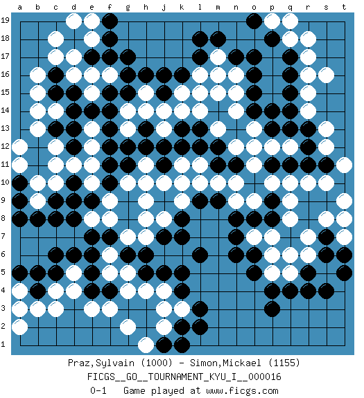 Last move : 0-1 2009 June 15 22:10:14 [Event "FICGS__GO__TOURNAMENT_KYU_I__000016"] [Site "FICGS"] [Date "2009.05.01"] [Round "1"] [Black "Praz,Sylvain"] [White "Simon,Mickael"] [Result "0-1"] [Rating 1 "1000"] [Rating 2 "1155"] 1.q16 d4 2.r4 d16 3.p3 r10 4.r8 r14 5.o17 s16 6.c6 f3 7.b4 c3 8.c9 j3 9.k16 r17 10.f17 c14 11.d18 c17 12.l3 c11 13.f15 m17 14.m16 l16 15.l17 l15 16.m18 m15 17.n17 k15 18.j16 n15 19.e6 r6 20.p8 p10 21.l6 p6 22.n8 n10 23.m9 m10 24.l9 l10 25.k4 j4 26.j15 j14 27.p14 k9 28.k8 j8 29.j9 k10 30.j7 h8 31.k7 h14 32.g15 h7 33.h6 h9 34.q17 q18 35.p18 r18 36.o15 n16 37.o16 m17 38.l18 s8 39.s7 r7 40.s6 s5 41.s9 q8 42.r9 q9 43.r5 s10 44.s4 t9 45.o5 b3 46.e9 e11 47.f13 h10 48.n13 m13 49.f11 e10 50.h12 n14 51.o6 p7 52.o8 o13 53.p13 o12 54.k12 c18 55.f10 b9 56.b8 b10 57.c8 e18 58.f18 e19 59.e17 d17 60.f19 d19 61.d12 c12 62.d13 c10 63.c13 b13 64.r13 s13 65.r12 s12 66.j11 j10 67.c15 b15 68.d14 b14 69.c5 g5 70.h5 h4 71.g6 f5 72.e5 f6 73.j5 g7 74.k5 e12 75.f12 p5 76.p4 e13 77.e14 h15 78.h16 t7 79.t5 p12 80.q14 r15 81.l13 k14 82.e4 e3 83.m12 n12 84.f7 f8 85.e7 e8 86.d8 f9 87.d9 a4 88.a5 c4 89.a3 a2 90.a9 g14 91.f14 o7 92.n7 a4 93.b5 a3 94.a10 a11 95.a8 a12 96.k2 j2 97.j1 h1 98.k1 g2 99.t6 k3 100.l2 t8 101.d15 g10 102.c16 b16 103.r11 q12 104.q13 q5 105.q4 d5 106.d6 e16 107.q7 q6 108.s11 t11 109.q11 f16 110.g16 l14 111.p11 o11 112.f4 g4 113.q15 r16 114.d10 d11 115.m11 h11 116.g11 g13 117.g12 l11 118.l12 k11 119.j12 n9 120.n6 o9 121.p9 q10 122.o14 p19 123.o19 q19 124.n11 e15 125.h13 m16 126.k13 j13 127.g17 pass 0-1 Here are the names of the openings (joseki) played in the four corners : Corner q16 : q16 r14 Hoshi (Hwajeom, Seongjeom, Xingwei`) 4-4 Point. The star or hoshi (4-4) point, emphasizing influence at the potential expense of territory. Ikken Kakari (Hankan Keolch'im, Yi Gua`jiao~, 1-Space Low Approach). White 2 is the standard approach move to the 4-4. Corner d4 : d4 c6 Hoshi (Hwajeom, Seongjeom, Xingwei`) 4-4 Point. The star or hoshi (4-4) point, emphasizing influence at the potential expense of territory. Ikken Kakari (Hankan Keolch'im, Yi Gua`jiao~, 1-Space Low Approach). Black 2 is the standard approach move to the 4-4. Corner d16 : d16 f17 Hoshi (Hwajeom, Seongjeom, Xingwei`) 4-4 Point. The star or hoshi (4-4) point, emphasizing influence at the potential expense of territory. Ikken Kakari (Hankan Keolch'im, Yi Gua`jiao~, 1-Space Low Approach). Black 2 is the standard approach move to the 4-4. Player White won this Go (weiqi, baduk) game. Follow this game move after move (download)A basic: Don't push too hard. (Jansteen) The weakness of an artist is dogma. (Josh Waitzkin)