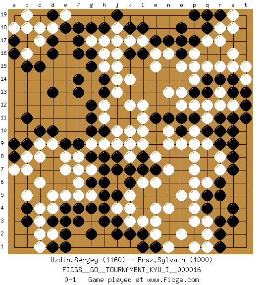 Last move : 0-1 2009 June 3 21:26:43 [Event "FICGS__GO__TOURNAMENT_KYU_I__000016"] [Site "FICGS"] [Date "2009.05.01"] [Round "1"] [Black "Uzdin,Sergey"] [White "Praz,Sylvain"] [Result "0-1"] [Rating 1 "1160"] [Rating 2 "1000"] 1.q16 d4 2.d17 q3 3.r5 p4 4.f3 c6 5.n3 k3 6.l2 n4 7.p2 q2 8.k2 l3 9.c15 k17 10.c10 d2 11.o17 g17 12.q10 r7 13.r6 o2 14.o3 p3 15.o4 p6 16.s7 r8 17.s8 p7 18.r9 p8 19.s3 m4 20.j3 o5 21.n2 p1 22.o10 r12 23.r14 p12 24.s11 n13 25.l16 n10 26.j5 k5 27.j7 j4 28.h4 k4 29.h3 j6 30.h5 h6 31.g6 h7 32.j8 o9 33.o11 o12 34.n11 n9 35.m11 k10 36.h8 g7 37.h10 k12 38.k11 k14 39.k16 j16 40.f18 g14 41.d13 l11 42.j11 l10 43.l7 m2 44.k6 f6 45.g2 g5 46.g4 k8 47.k7 k9 48.h18 l12 49.j17 h16 50.g8 f8 51.f9 e8 52.e9 q9 53.s10 p10 54.p11 q11 55.p9 r4 56.s4 p10 57.f7 r10 58.g6 e7 59.s9 f5 60.f13 g13 61.j12 j13 62.f14 n16 63.m17 p15 64.g12 j18 65.g18 h17 66.f17 m15 67.n17 r17 68.r16 q17 69.p17 s16 70.q18 r18 71.p19 s15 72.o18 p16 73.s13 r15 74.r2 c8 75.g15 h15 76.b9 b8 77.q14 q15 78.f16 l17 79.l18 m16 80.k18 j17 81.j19 g7 82.h6 r13 83.s14 m6 84.m7 n7 85.g16 h12 86.h14 j15 87.h13 j14 88.a8 a7 89.a9 b7 90.r3 q6 91.q5 p5 92.p13 s12 93.t12 p14 94.r11 q12 95.q10 p9 96.q13 o13 97.t13 m8 98.m1 m3 99.e4 e5 100.d3 c3 101.e2 c2 102.e3 d5 103.r19 s19 104.q19 s18 105.q4 d9 106.d10 c9 107.b11 l6 108.l8 l9 109.r10 j10 110.j2 n1 111.l1 h11 112.g11 h9 113.g10 j9 114.o16 o15 115.d1 c1 116.e1 t15 117.r1 t14 118.t11 g9 119.h7 f7 120.f4 c17 121.d16 b16 122.b15 b18 123.a17 d18 124.a16 a18 125.d19 e19 126.c19 b19 127.e18 c18 128.d19 q1 129.b4 b5 130.b3 c4 131.pass pass 0-1 Here are the names of the openings (joseki) played in the four corners : Corner q4 : q3 r5 Komoku (Somok, Xiao~mu`) 3-4 Point. The komoku (3-4) point is the traditional corner enclosure move.. Ikken Kakari (Hankan Keolch'im, Yi Gua`jiao~, 1-Space Low Pincer). The small knight move is the basic approach move to the 3-4 point stone. It has been continually used for over four centuries. There are limitless variations, with new moves constantly being discovered. Black 2 opens the door to a treaure store of joseki. Corner d4 : d4 f3 Hoshi (Hwajeom, Seongjeom, Xingwei`) 4-4 Point. The star or hoshi (4-4) point, emphasizing influence at the potential expense of territory. Ikken Kakari (Hankan Keolch'im, Yi Gua`jiao~, 1-Space Low Approach). Black 2 is the standard approach move to the 4-4. Player White won this Go (weiqi, baduk) game. Follow this game move after move (download)Everything would seem to be possible in Go. Like pulling a rabbit, by a magical move, out of a hat. (Pierre Audouard) Creativity involves breaking out of established patterns in order to look at things in a different way. (Edward De Bono)