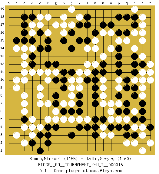 Last move : 0-1 2009 June 5 0:16:5 [Event "FICGS__GO__TOURNAMENT_KYU_I__000016"] [Site "FICGS"] [Date "2009.05.01"] [Round "1"] [Black "Simon,Mickael"] [White "Uzdin,Sergey"] [Result "0-1"] [Rating 1 "1155"] [Rating 2 "1160"] 1.q16 d16 2.q4 d3 3.c5 e4 4.f17 d14 5.c9 c11 6.j3 c7 7.c3 c2 8.d4 b3 9.d2 c4 10.e3 d5 11.f4 e2 12.f3 o3 13.m3 q2 14.r3 r2 15.s2 r14 16.o17 s16 17.r17 q15 18.r12 r16 19.p16 r10 20.r8 p10 21.p12 r6 22.p8 r4 23.r5 s4 24.s5 s3 25.q3 t2 26.t4 s1 27.q6 o14 28.l17 j17 29.l15 m14 30.j14 n10 31.n12 l14 32.k15 l12 33.m11 l11 34.m10 n9 35.m9 n8 36.m8 n7 37.m7 p7 38.q7 p5 39.p6 o7 40.n5 q5 41.p4 o5 42.o4 o6 43.s6 n4 44.m4 n3 45.m5 e9 46.d8 e8 47.d7 c6 48.e6 f5 49.e5 d4 50.f6 g5 51.g4 g6 52.f2 f7 53.e1 p9 54.s10 s9 55.r9 s11 56.q10 t10 57.r11 s13 58.s12 t12 59.s10 t11 60.r13 s15 61.p11 s8 62.s7 r10 63.q9 k9 64.g7 h7 65.g8 j5 66.j6 j7 67.k6 k5 68.h6 h5 69.k7 j8 70.k8 j10 71.h9 j9 72.g10 e11 73.g12 g11 74.h11 f11 75.j11 k11 76.h10 b10 77.k4 l5 78.l4 e7 79.d6 c8 80.d9 b9 81.l10 k10 82.c17 d17 83.d18 e18 84.c18 e17 85.b15 b14 86.c15 c14 87.d15 e15 88.c16 f16 89.f14 h16 90.h15 g17 91.k17 s10 92.p14 p15 93.p13 n16 94.n17 s17 95.r18 o16 96.j18 h18 97.j16 h17 98.e14 k18 99.l18 j19 100.f15 n13 101.e16 f18 102.m16 s18 103.p18 r19 104.q18 m12 105.n11 m15 106.d13 c13 107.d12 c12 108.d10 d11 109.e10 f10 110.f12 c10 0-1 Here are the names of the openings (joseki) played in the four corners : Corner d4 : d3 c5 Komoku (Somok, Xiao~mu`) 3-4 Point. The komoku (3-4) point is the traditional corner enclosure move.. Ikken Kakari (Hankan Keolch'im, Yi Gua`jiao~, 1-Space Low Pincer). The small knight move is the basic approach move to the 3-4 point stone. It has been continually used for over four centuries. There are limitless variations, with new moves constantly being discovered. Black 2 opens the door to a treaure store of joseki. Corner d16 : d16 f17 Hoshi (Hwajeom, Seongjeom, Xingwei`) 4-4 Point. The star or hoshi (4-4) point, emphasizing influence at the potential expense of territory. Ikken Kakari (Hankan Keolch'im, Yi Gua`jiao~, 1-Space Low Approach). Black 2 is the standard approach move to the 4-4. Corner q4 : q4 o3 Hoshi (Hwajeom, Seongjeom, Xingwei`) 4-4 Point. The star or hoshi (4-4) point, emphasizing influence at the potential expense of territory. Ikken Kakari (Hankan Keolch'im, Yi Gua`jiao~, 1-Space Low Approach). White 2 is the standard approach move to the 4-4. Corner q16 : q16 r14 Hoshi (Hwajeom, Seongjeom, Xingwei`) 4-4 Point. The star or hoshi (4-4) point, emphasizing influence at the potential expense of territory. Ikken Kakari (Hankan Keolch'im, Yi Gua`jiao~, 1-Space Low Approach). White 2 is the standard approach move to the 4-4. Player White won this Go (weiqi, baduk) game. Follow this game move after move (download)Don't make dango's. (Anonymous) Work expands to fill the time available. (C. Northcote Parkinson, in Parkinson's Laws)