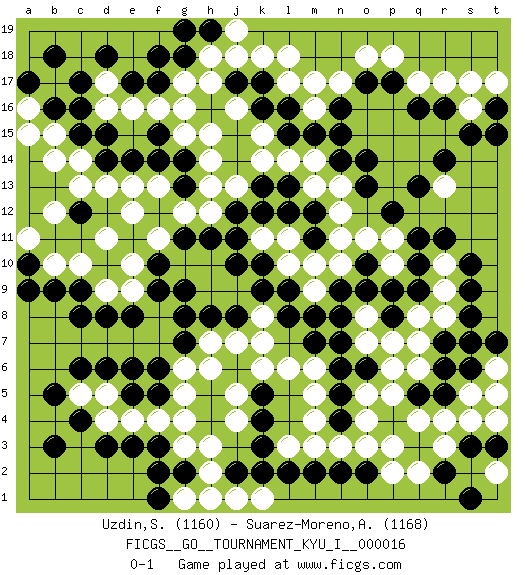 Last move : 0-1 2009 June 3 21:28:0 [Event "FICGS__GO__TOURNAMENT_KYU_I__000016"] [Site "FICGS"] [Date "2009.05.01"] [Round "1"] [Black "Uzdin,Sergey"] [White "Suarez-Moreno,Alejandro"] [Result "0-1"] [Rating 1 "1160"] [Rating 2 "1168"] 1.q16 d17 2.d3 q4 3.c15 c10 4.c17 d16 5.c16 h17 6.q10 c5 7.c4 d5 8.f3 e4 9.e3 m4 10.r6 r13 11.k17 j16 12.k16 r17 13.r16 q17 14.p17 s16 15.s15 s17 16.r14 p18 17.o17 o18 18.q13 n17 19.n16 q8 20.s8 q6 21.r5 r4 22.k3 l3 23.c12 h3 24.k4 j4 25.k5 j5 26.c8 e10 27.e8 g5 28.g8 g10 29.j8 k7 30.j10 h9 31.h8 j9 32.k9 k8 33.k10 j7 34.g9 h10 35.f10 f11 36.f9 h12 37.e11 e12 38.g11 d11 39.h11 g12 40.j12 j13 41.e14 d13 42.d14 c13 43.g14 h14 44.f17 f16 45.e17 e16 46.d18 g16 47.k13 k15 48.l15 k14 49.l13 l14 50.m15 m14 51.n14 m13 52.m12 n13 53.o9 o8 54.m7 l6 55.n8 o7 56.b5 g3 57.c6 c14 58.d15 r9 59.s9 r10 60.s10 p10 61.r11 p11 62.o14 n12 63.m11 n10 64.n9 m10 65.o10 n11 66.q9 r8 67.p9 o11 68.q11 m6 69.p8 p7 70.r7 q7 71.k12 m17 72.b9 b10 73.g18 h18 74.l16 l18 75.d6 f4 76.g13 h13 77.p12 b15 78.b16 b14 79.a10 a11 80.a9 b12 81.q5 p5 82.p4 p3 83.n6 o5 84.n5 o4 85.n7 m5 86.g2 h2 87.f1 s5 88.s6 t6 89.s7 t4 90.t7 t5 91.h1 j1 92.j2 g1 93.o6 p6 94.h1 k1 95.l2 g1 96.f2 h1 97.n2 n3 98.o2 p2 99.k2 k6 100.l8 m9 101.e6 h7 102.h19 j19 103.g19 k18 104.j17 j18 105.c9 g17 106.f18 l11 107.l12 k11 108.j11 l10 109.b18 g15 110.f15 a16 111.a17 a15 112.f5 g6 113.f6 d4 114.b3 d9 115.d8 f13 116.f14 h15 117.n4 o3 118.g7 h6 119.t16 t17 120.t15 m16 121.n15 e13 122.o13 e9 123.e5 g4 124.s3 s4 125.r2 q2 126.m2 m3 127.s1 t2 128.t3 r3 129.l9 l17 130.m8 pass 0-1 Here are the names of the openings (joseki) played in the four corners : Corner d16 : d17 c15 Komoku (Somok, Xiao~mu`) 3-4 Point. The komoku (3-4) point is the traditional corner enclosure move.. Ikken Kakari (Hankan Keolch'im, Yi Gua`jiao~, 1-Space Low Pincer). The small knight move is the basic approach move to the 3-4 point stone. It has been continually used for over four centuries. There are limitless variations, with new moves constantly being discovered. Black 2 opens the door to a treaure store of joseki. Corner d4 : d3 c5 Komoku (Somok, Xiao~mu`) 3-4 Point. The komoku (3-4) point is the traditional corner enclosure move.. Ikken Kakari (Hankan Keolch'im, Yi Gua`jiao~, 1-Space Low Pincer). The small knight move is the basic approach move to the 3-4 point stone. It has been continually used for over four centuries. There are limitless variations, with new moves constantly being discovered. White 2 opens the door to a treaure store of joseki. Corner q16 : q16 r13 Hoshi (Hwajeom, Seongjeom, Xingwei`) 4-4 Point. The star or hoshi (4-4) point, emphasizing influence at the potential expense of territory. Nikken Kakari (Dukan Keolch'im, E`r Gua`jiao~, 2-Space Low Approach). Black typically answers by 7-3 or 3-5 (which is not joseki). Player White won this Go (weiqi, baduk) game. Follow this game move after move (download)If you have lost four corners, resign. (Anonymous) How many people work in NATO Headquarters ? - About half of them. (Dirk Stikker, NATO general secretary)