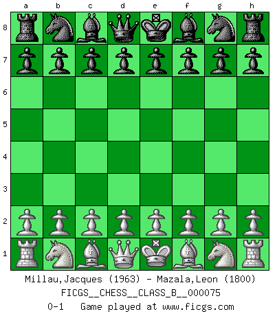 Last move : 0-1 2009 July 1 21:19:2 [Event "FICGS__CHESS__CLASS_B__000075"] [Site "FICGS"] [Date "2009.05.02"] [Round "1"] [White "Millau,Jacques"] [Black "Mazala,Leon"] [Result "0-1"] [WhiteElo "1963"] [BlackElo "1800"] 0-1 Player Black won this chess game. Follow this game move after move (download)Good offense and good defense both begin with good development. (Bruce A. Moon) Besser ein falscher Plan, logisch durchgeführt, als gar kein Plan. (Viktor Kortschnoi) Un juego de Ajedrez es un dialogo, una conversación entre un jugador y su oponente. Cada movimiento del oponente puede contener amenazas o tropiezos, pero un jugador no se puede defender de las amenazas o tomar ventaja de los tropiezos si es que no se pregunta a sí mismo: ¿Que es lo que mi oponente va a hacer después de cada movida?. (Bruce A. Moon) Une platitude souvent récitée à propos des Echecs est qu'une des choses les plus difficiles à réaliser est de gagner une position gagnante. Cela ne manque pas de sens mais, pour ma part, j'ai toujours trouvé plus difficile de gagner une position perdante. (Tim Krabbe) Crush them ! Make them suffer ! (General Grievous in Star Wars ep.3)