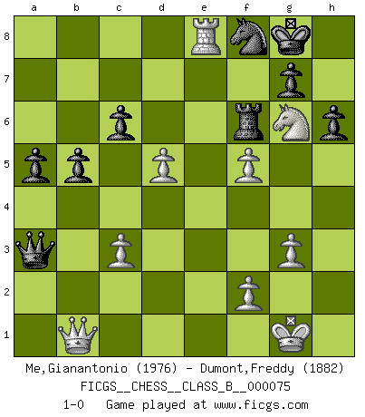 Last move : 1-0 2010 January 18 16:31:6 [Event "FICGS__CHESS__CLASS_B__000075"] [Site "FICGS"] [Date "2009.05.02"] [Round "1"] [White "Me,Gianantonio"] [Black "Dumont,Freddy"] [Result "1-0"] [WhiteElo "1976"] [BlackElo "1882"] 1.d4 Nf6 2.c4 c6 3.Nc3 d5 4.Nf3 e6 5.Bg5 Nbd7 6.e3 Qa5 7.cxd5 Nxd5 8.Qd2 Bb4 9.Rc1 f6 10.Bh4 O-O 11.Bd3 e5 12.O-O exd4 13.exd4 h6 14.Qc2 Nf4 15.Qb3+ Kh8 16.Bb1 Rd8 17.Rfe1 Nf8 18.Bg3 Nh5 19.Nh4 Nxg3 20.hxg3 Bg4 21.a3 Bxc3 22.bxc3 Rd7 23.Ba2 Qd5 24.Qc2 Qa5 25.Re4 Bh5 26.g4 Bf7 27.Rce1 Qxa3 28.Bxf7 Rxf7 29.Re8 Rxe8 30.Rxe8 Kg8 31.Ng6 f5 32.gxf5 Rf6 33.Qb1 a5 34.g3 b5 35.d5 1-0 Queen's pawn game Kingside Castling by player Black (move 10) Kingside Castling by player White (move 12) Player White won this chess game. Follow this game move after move (download)For me, Chess is life and every game is like a new life. Every Chess player gets to live many lives in one lifetime. (Eduard Gufeld) Mein Name ist Rustam Kamsky. Sie haben meinen Sohn belästigt. Bereiten Sie sich aufs Sterben vor. (Rustam Kamsky) Yo tuve un dolor de muelas en la primer partida. En el segundo juego, tuve un dolor de cabeza. En el tercero, tuve un ataque de reumatísmo. En la cuarta partida, no me sentía muy bien. ¿Y en el quinto juego? Bueno, ¿que acaso uno tiene que ganar todos los juegos?. (Siegbert Tarrasch) Les échecs c'est le défi de l'alpiniste, toujours plus haut, prêt à tout pour monter à l'assaut du Roi ennemi. Les échecs, c'est de la musique en mouvement, un ballet majestueux pour les yeux. C'est de la poésie composée par les fantômes du passé qui au même titre que Rimbaud ou Verlaine méritent notre admiration. Les échecs, c'est de la peinture ou le moindre mouvement modifie le tableau pour en faire un Picasso ou un Van Gogh. Les échecs, c'est tout et rien, c'est la vie et la mort. Jjulie33 sur le forum de France-Echecs. The bottom line is always the bottom line. (Johann Piek)