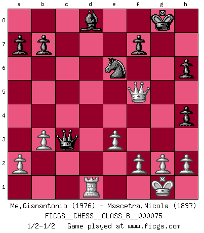 Last move : 1/2-1/2 2009 August 20 10:4:11 [Event "FICGS__CHESS__CLASS_B__000075"] [Site "FICGS"] [Date "2009.05.02"] [Round "1"] [White "Me,Gianantonio"] [Black "Mascetra,Nicola"] [Result "1/2-1/2"] [WhiteElo "1976"] [BlackElo "1897"] 1.d4 d5 2.c4 e6 3.Nc3 Nf6 4.cxd5 exd5 5.Bg5 c6 6.e3 h6 7.Bh4 Be7 8.Qc2 O-O 9.Bd3 c5 10.dxc5 Be6 11.Nge2 Nbd7 12.Rd1 Nxc5 13.Bf5 Qb6 14.O-O Rfd8 15.Nf4 g5 16.Bxe6 Nxe6 17.Ncxd5 Rxd5 18.Nxd5 Nxd5 19.Rxd5 gxh4 20.Rfd1 Rd8 21.b3 Qb4 22.Rxd8+ Bxd8 23.Qf5 Qc3 1/2-1/2 QGD : Exchange, positional line, 5...c6 Kingside Castling by player Black (move 8) Kingside Castling by player White (move 14) This chess game ended in a draw. Follow this game move after move (download)Life is a kind of Chess, with struggle, competition, good and ill events. (Benjamin Franklin) Man gibt nur Pakete auf. (Paul Keres) Durante una competencia de Ajedrez, un Maestro de Ajedrez deberá ser una combinación de presa de caza y un Monge. (Alexander Alekhine) Les sacrifices démontrent seulement que quelqu'un a gaffé. (Savielly Tartacover) Lamb in skin of tiger, still fears the wolf. (Chinese proverb)