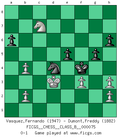 Last move : 0-1 2010 May 26 8:38:15 [Event "FICGS__CHESS__CLASS_B__000075"] [Site "FICGS"] [Date "2009.05.02"] [Round "1"] [White "Vasquez,Fernando"] [Black "Dumont,Freddy"] [Result "0-1"] [WhiteElo "1947"] [BlackElo "1882"] 1.e4 c5 2.d4 cxd4 3.c3 Nf6 4.e5 Nd5 5.Nf3 e6 6.cxd4 d6 7.Bc4 Nb6 8.Bd3 Nc6 9.O-O Nb4 10.Bg5 Be7 11.Bxe7 Qxe7 12.Nc3 O-O 13.Re1 Bd7 14.Be4 Bc6 15.a3 N4d5 16.Qd3 h6 17.Nb5 Nf4 18.exd6 Qf6 19.Qf1 Nh3+ 20.gxh3 Bxe4 21.Rxe4 Qxf3 22.Rg4 a6 23.Nc3 Rad8 24.Re1 Rxd6 25.Re3 Qf5 26.Qg2 g6 27.Qxb7 Nc4 28.Rf3 Rd7 29.Qc6 Rd6 30.Qxd6 Nxd6 31.Rxf5 Nxf5 32.d5 Rb8 33.Rb4 Rxb4 34.axb4 Nd4 35.dxe6 fxe6 36.Kg2 Kf7 37.Kg3 e5 38.Nd5 Nb5 39.Kf3 Ke6 40.Nc3 Kf5 41.Ke3 Nd4 42.Nd5 g5 43.f3 Nc6 44.Kd3 Nd4 45.Nc7 Kf4 0-1 This chess game has been lost on time (started : 2009.05.02 20:0:21) Sicilian : Smith-Morra gambit Kingside Castling by player White (move 9) Kingside Castling by player Black (move 12) Player Black won this chess game. Follow this game move after move (download)Chess is not like life... it has rules ! (Mark Pasternak) Es gibt zwei Arten von Opfern: Korrekte und meine. (Mikhail Nekhemyevich Tal) Con el fin de mejorar tu juego, debes de estudiar los finales antes que todo, ya que mientras que los finales pueden ser estudiados y dominados por sí mismos, el juegomedio y la apertura deben de ser estudiados en relación con los finales. (José Raúl Capablanca) Il (Jacob Murray) ne joue pas pour le bon coup, mais pour le meilleur. (Eloi Relange) No enterprise is more likely to succeed than one concealed from the enemy until it is ripe for execution. (Niccolo Machiavelli)