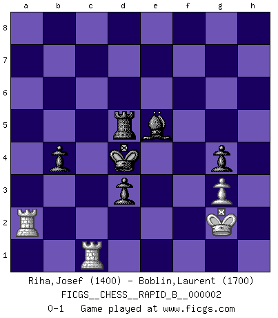 Last move : 0-1 2006 June 16 13:36:29 [Event "FICGS__CHESS__RAPID_B__000002"] [Site "FICGS"] [Date "2006.04.19"] [Round "1"] [White "Riha,Josef"] [Black "Boblin,Laurent"] [Result "0-1"] [WhiteElo "1400"] [BlackElo "1700"] 1.e4 c6 2.d4 d5 3.Nc3 dxe4 4.Nxe4 Nd7 5.Nf3 Ngf6 6.Nxf6+ Nxf6 7.c3 Bg4 8.h3 Bxf3 9.Qxf3 Qd5 10.Be2 e6 11.O-O Bd6 12.Rd1 O-O 13.c4 Qxf3 14.Bxf3 Rfd8 15.Be3 h6 16.a3 g5 17.Bd2 Kg7 18.g3 Kg6 19.b4 h5 20.Bc3 g4 21.hxg4 hxg4 22.Be2 Ne4 23.Bd3 f5 24.Bxe4 fxe4 25.Rd2 Rf8 26.Re1 Rf3 27.Bb2 Kf5 28.Rde2 Rb3 29.Kg2 Rh8 30.d5 Rxb2 31.Rxb2 exd5 32.Rbe2 Be5 33.cxd5 cxd5 34.Rd2 Ke6 35.Red1 Rd8 36.Rh1 d4 37.Re2 Kd5 38.Rhe1 e3 39.fxe3 d3 40.Rd1 Ke4 41.Rf2 Rd5 42.a4 a6 43.b5 axb5 44.axb5 Rxb5 45.Ra2 Kxe3 46.Re1+ Kd4 47.Kf2 Rd5 48.Rc1 b5 49.Kg2 b4 0-1 Caro-Kann : Steinitz variation Kingside Castling by player White (move 11) Kingside Castling by player Black (move 12) 10 pieces endgame at move 45 : White KRRP , Black KRBPPP WHITE : King + 2 Rooks 1 Pawn BLACK : King + 1 Rook 1 Bishop 3 Pawns Player Black won this chess game. Follow this game move after move (download)Chess is a fighting game which is purely intellectual and includes chance. (Richard Reti) Im Leben werden Partien nie so unstrittig gewonnen wie im Spiel (Emanuel Lasker) Te sientas frente a un tablero y repentinamente tu corazón brinca. Tu mano tiembla al tomar una pieza y moverla. Pero lo que el Ajedrez te enseña es que tu debes permanecer ahí con calma y pensar de que si realmente es una buena idea o de que si hay otras ideas mejores. (Stanley Kubrick) Un footballeur joue avec ses pieds, parfois avec sa tête. Un joueur d'échecs ne joue qu'avec sa tête. Et quand il ne joue plus, il meurt. (Jacob Murray) Life is the sum of all your choices. (Albert Camus)
